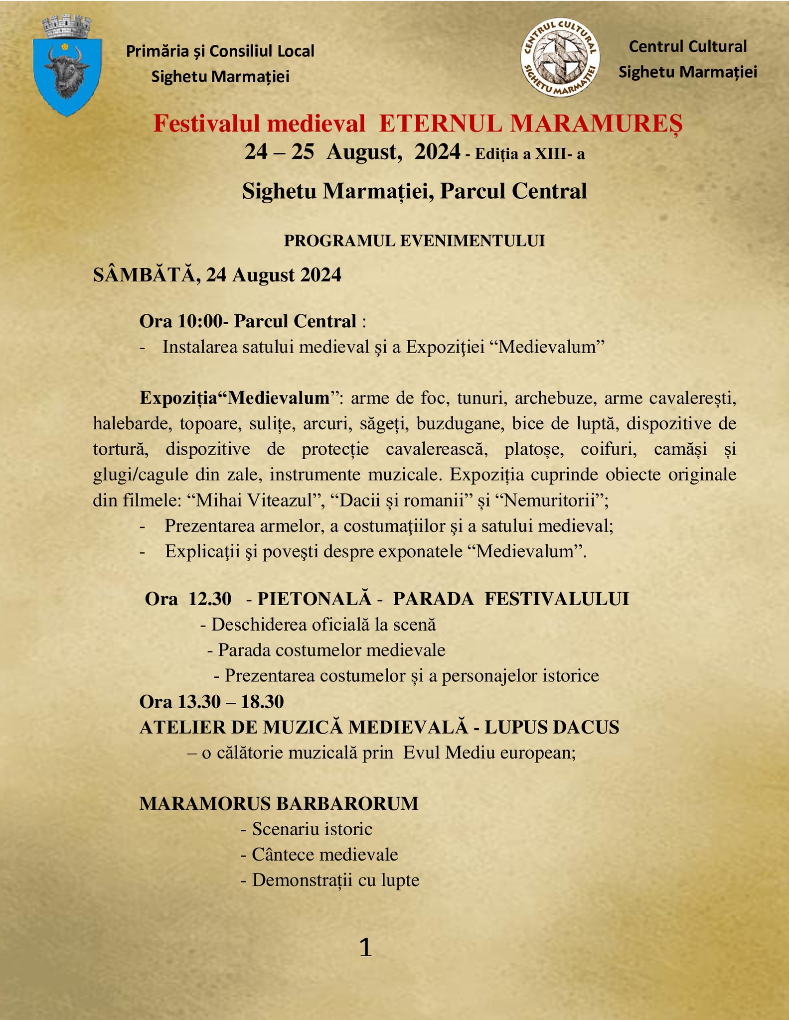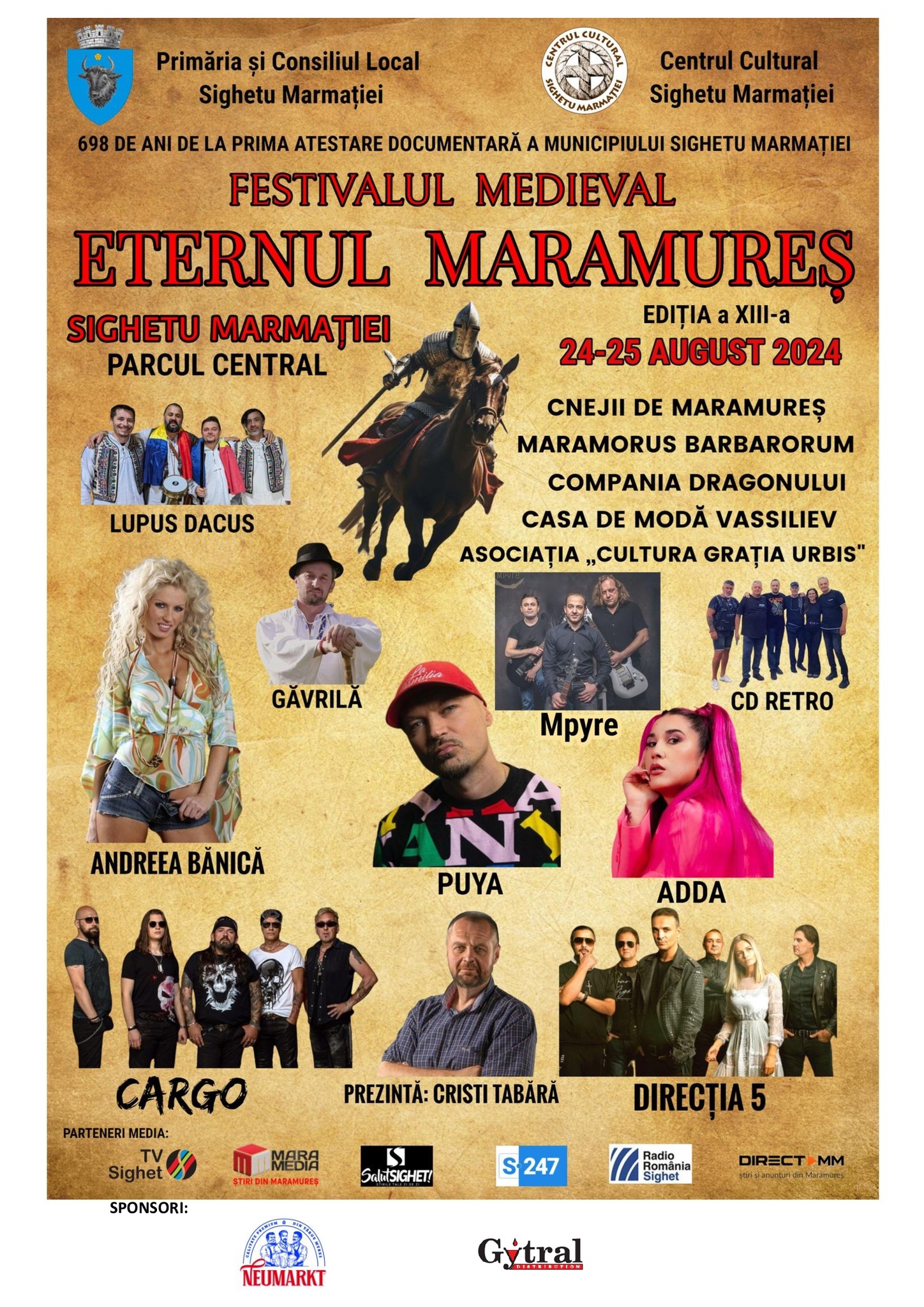În perioada 24-25 august, Parcul Central din Sighetu Marmației va găzdui cea de-a XIII-a ediție a Festivalul Medieval „Eternul Maramureș”. Anul acesta se împlinesc 698 de ani de la prima atestare documentară a municipiului.