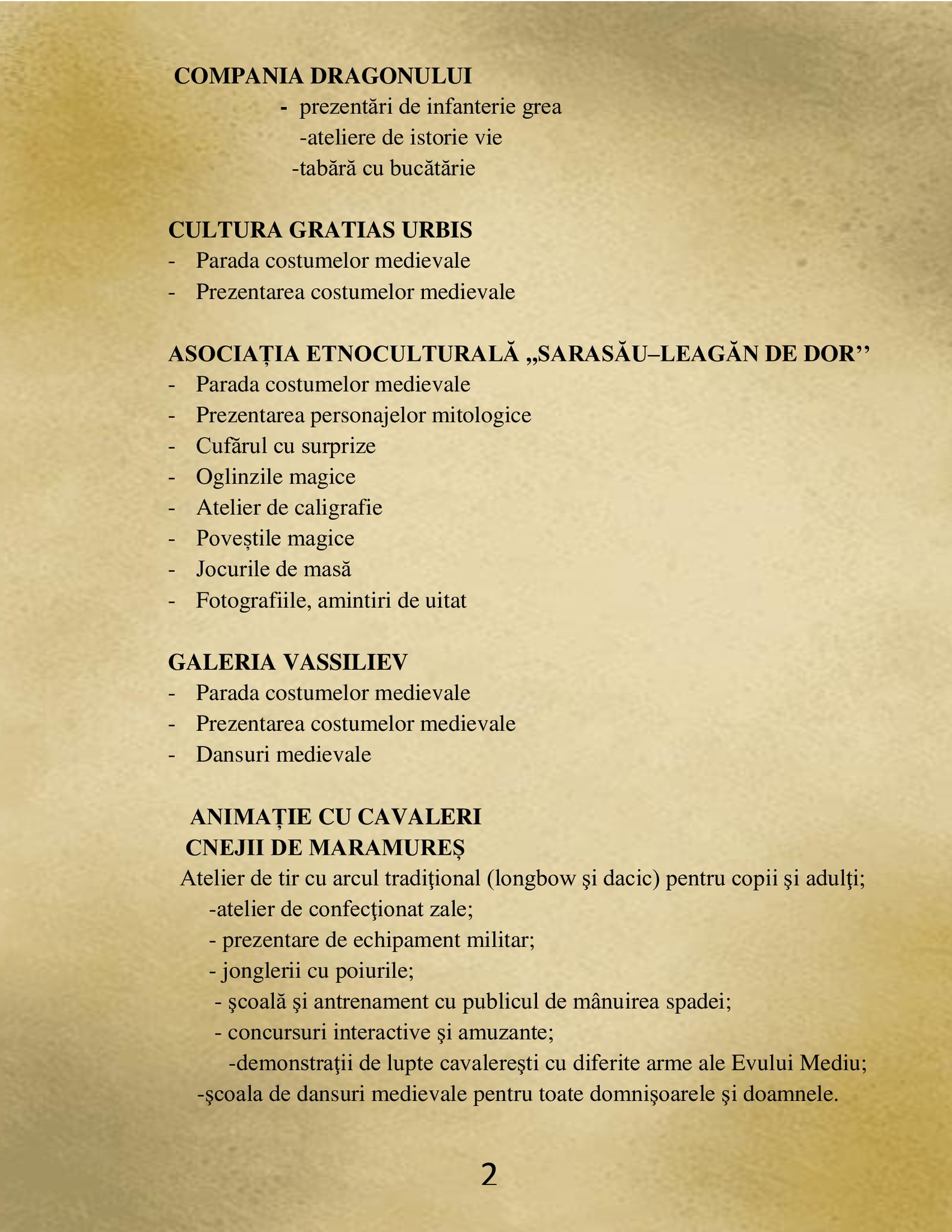 Evenimentul va reuni în acelaşi spaţiu parade ale costumelor medievale, personaje istorice, demonstraţii de lupte cavalereşti, dar și concerte susținute de artiști îndrăgiți.