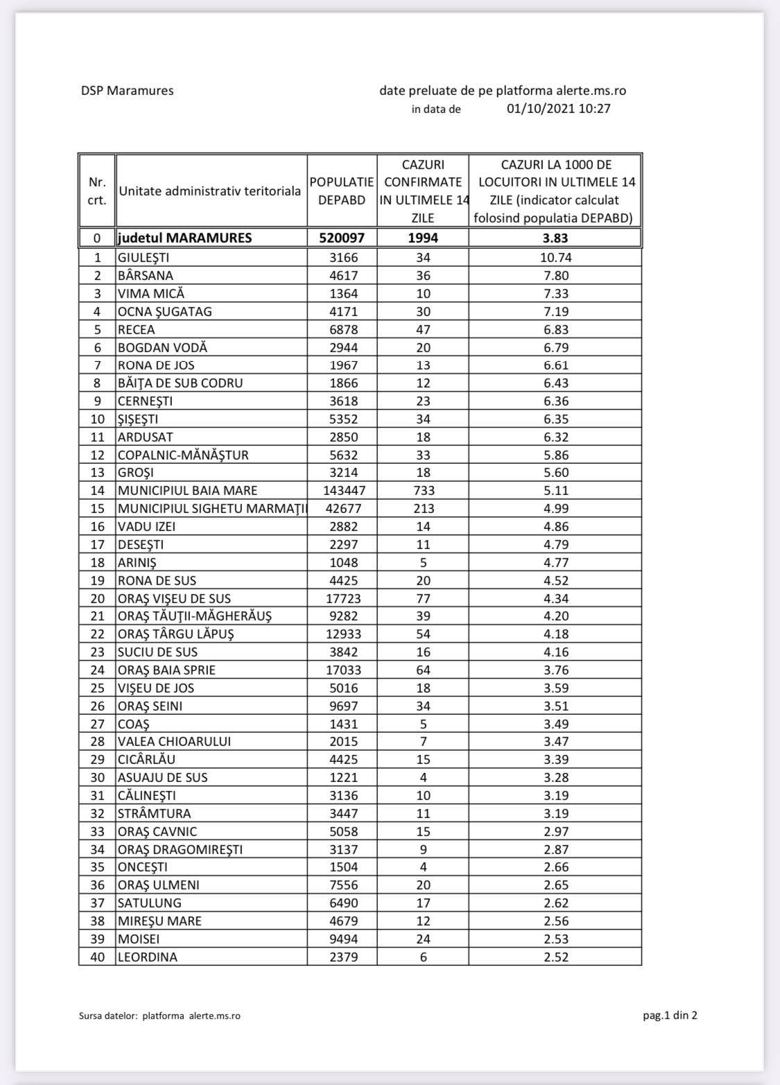Cu toate acestea reședința de județ are o incidență mult mai mică raportată la mia de locuitori față de celelalte unități administrativ-teritoriale (UAT) care au înregistrat cazuri în aceste două săptămâni. În Maramureș s-au confirmat cazuri în 72 UAT-uri, și aici existând o creștere considerabilă, iar municipiul Baia Mare se află pe locul 14. Pe primele cinci locuri în topul incidenței se află cinci comune, respectiv Giulești, Bârsana, Vima Mică, Bogdan Vodă și Ocna Șugatag. Avem în 1 octombrie 29 UAT-uri unde sunt instituite măsuri suplimentare de protecție iar aici ne referim la cele 3 UAT-uri, Bârsana, Asuaju de Sus și Giulești, care sunt carantinate, respectiv încă 3 UAT care sunt semicarantinate, deci cu măsuri mai drastice, Bogdan Vodă, Vima Mică și Ocna Șugatag, dar și alte 23 UAT-uri, care au incidența mai mare de 3 la mie, Baia Sprie, Vadu Izei, Suciu de Sus, Groși, Rona de Sus, Târgu Lăpuș, Seini, Cernești, Valea Chioarului, Cicârlău, Tăuții Măgherăuș, Vișeu de Jos, Sighetu Marmației, Șișești, Moisei, Ardusat, Baia Mare, Călinești, Rona de Jos, Băița de Sub Codru, Recea, Copalnic Mănăștur și Vișeu de Sus. Cifrele luate în considerare sunt cele de sâmbătă, 25 septembrie, astfel că s-au instituit restricții suplimentare la cea mai recentă ședință de CJSU Maramureș. La cum arată lucrurile putem să ne așteptăm la mai multe situații în intervalul viitor, întrucât tendința este tot de creștere a numărului de cazuri. În prezent, azi avem 2 UAT-uri peste 7,5 (una peste 10, una peste 7), 9 UAT-uri cu incidența peste 6 dar sub 7,5 (două peste 7, șapte peste 6) și încă 21 UAT-uri cu incidența mai mare de 3 dar sub 6 la mie.