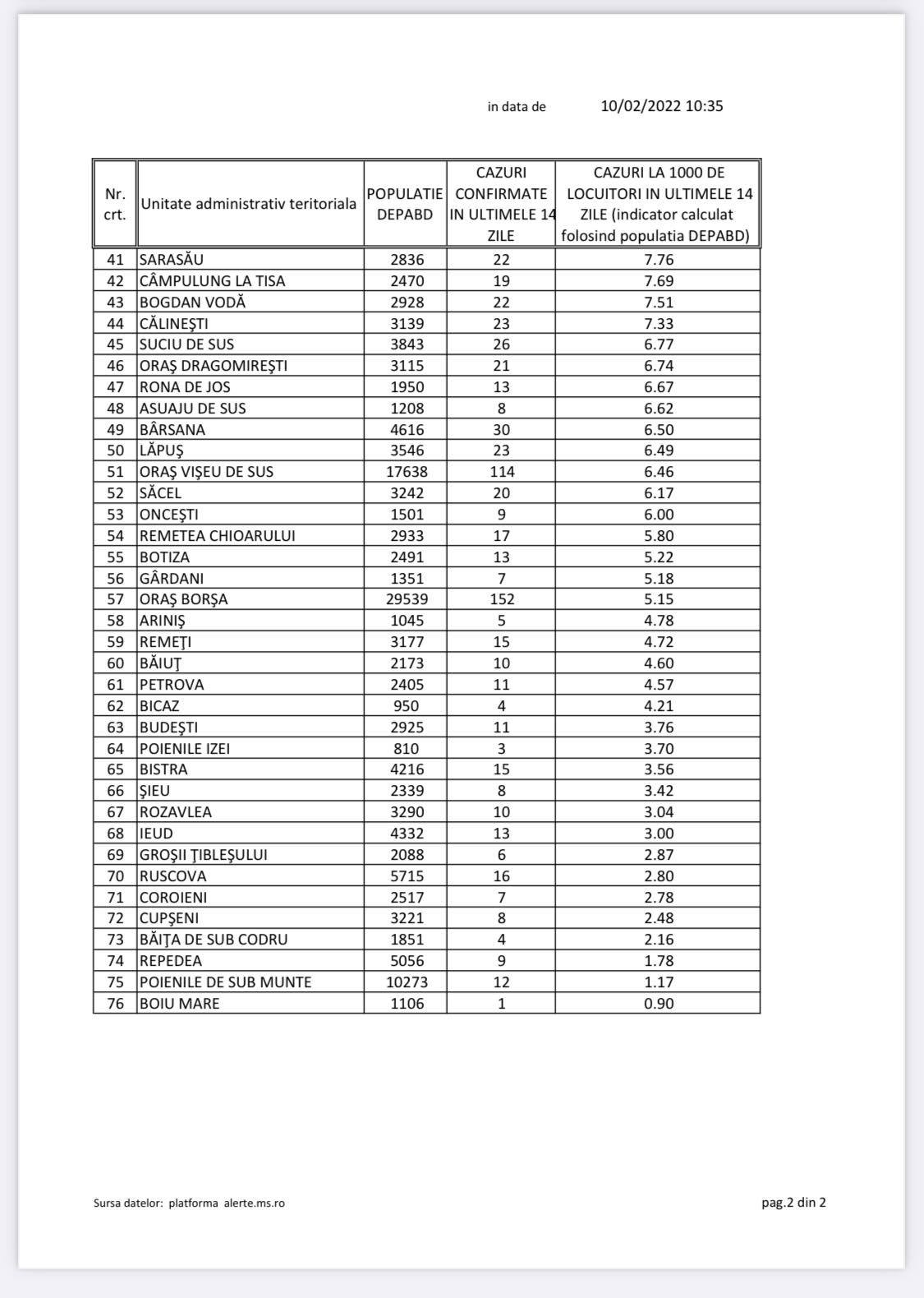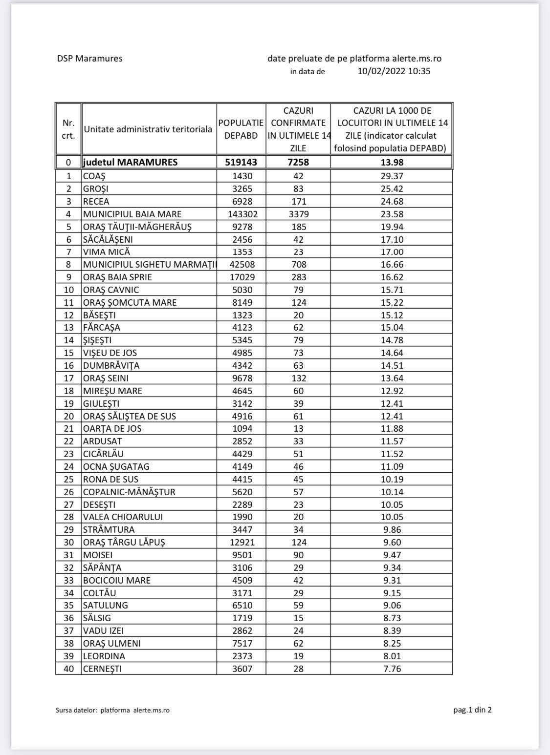 Statistică 10 februarie România: În județul Maramureș evidență nouă a cazurilor în noul val! Total 7258 în interval de 14 zile! Vezi clasamentul pe localități!
