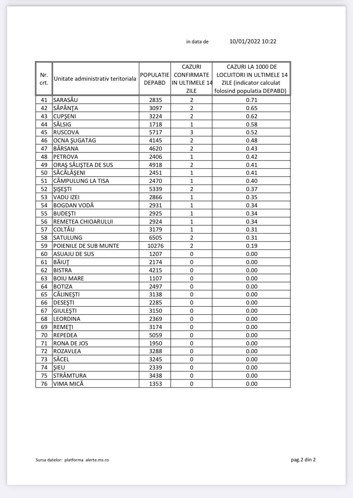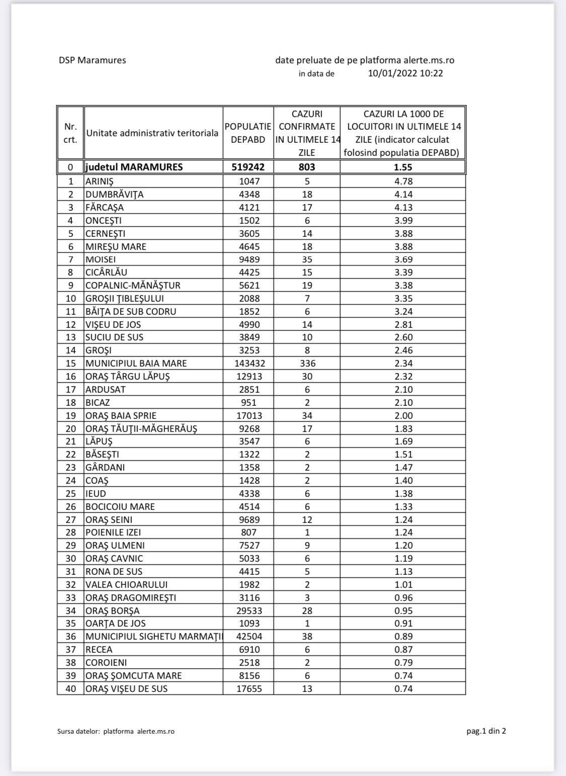 În Maramureș s-au confirmat cazuri în majoritatea celor 76 unități administrativ teritoriale (UAT-uri), în 59 UAT-uri mai exact din total, iar municipiul Baia Mare se află pe locul 15, și se află peste pragul de 2 la mie. Pe primele cinci locuri în topul incidenței se află cinci comune, respectiv Ariniș, Dumbrăvița, Fărcașa, Oncești și Cernești. Toți indicii sunt în creștere evidentă așadar. Avem în 10 ianuarie 3 UAT-uri cu incidența mai mare de 4, 8 UAT-uri cu incidența mai mare de 3, 8 UAT-uri cu incidența mai mare de 2 sau egală și 13 UAT-uri cu incidența mai mare de 1, restul sunt sub 1.