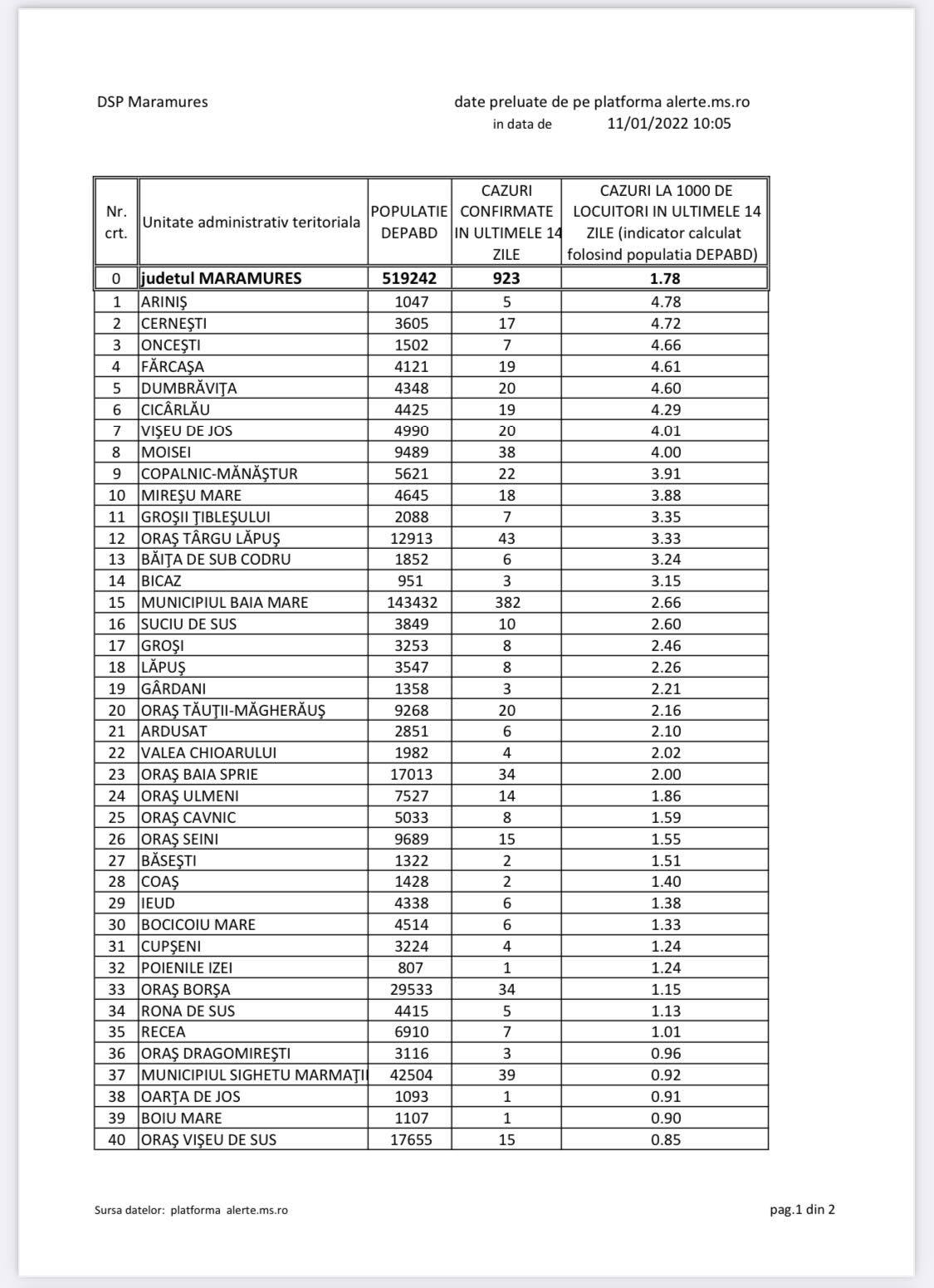 În Maramureș s-au confirmat cazuri în majoritatea celor 76 unități administrativ teritoriale (UAT-uri), în 61 UAT-uri mai exact din total, iar municipiul Baia Mare se află pe locul 15, și se află peste pragul de 2 la mie. Pe primele cinci locuri în topul incidenței se află cinci comune, respectiv Ariniș, Cernești, Oncești, Fărcașa și Dumbrăvița. Toți indicii sunt în creștere evidentă așadar. Avem în 11 ianuarie 8 UAT-uri cu incidența mai mare de 4 sau egal, 6 UAT-uri cu incidența mai mare de 3 sau egal, 9 UAT-uri cu incidența mai mare de 2 sau egal și 12 UAT-uri cu incidența mai mare de 1, restul sunt sub 1.