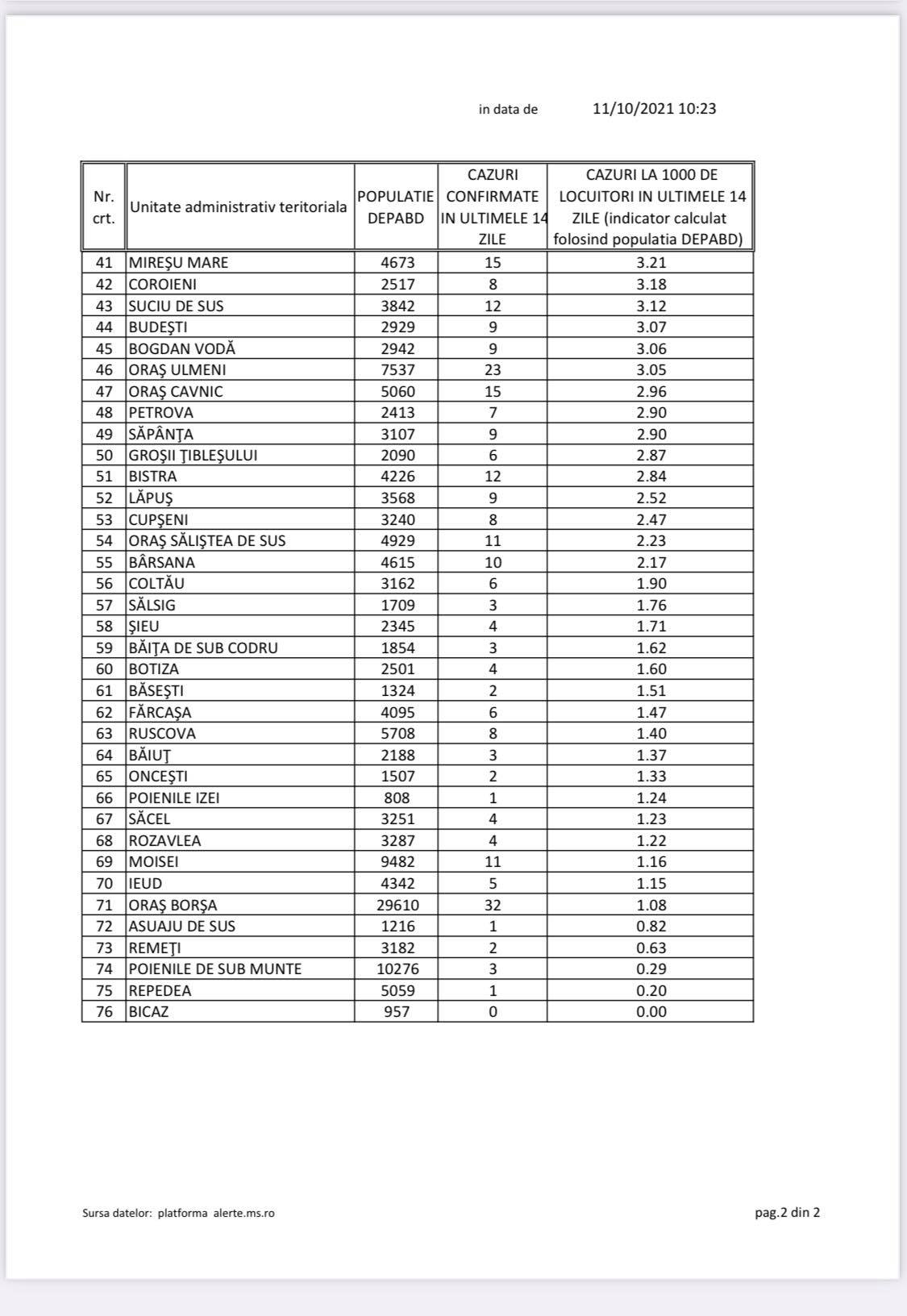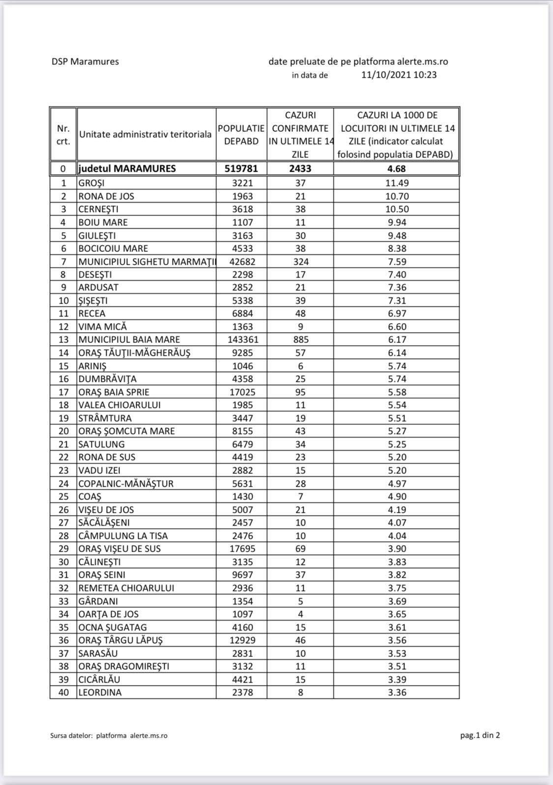 Cu toate acestea reședința de județ are o incidență mult mai mică raportată la mia de locuitori față de celelalte unități administrativ-teritoriale (UAT) care au înregistrat cazuri în aceste două săptămâni. În Maramureș s-au confirmat cazuri în 75 UAT-uri (singura excepţie este Bicaz), și aici existând o creștere considerabilă, iar municipiul Baia Mare se află pe locul 13, din nou, și se află peste pragul de 6 la mie (carantina se introduce la peste 7,5 la mie). Pe primele cinci locuri în topul incidenței se află cinci comune, respectiv Groși, Rona de Jos, Cernești, Boiu Mare și Giulești. Avem în 11 octombrie numeroase UAT-uri unde sunt instituite măsuri suplimentare de protecție. Știm că avem 6 UAT-uri carantinate, Bârsana, Giulești (ambele din 22 septembrie cu prelungire, dar Bârsana doar până astăzi, la ora 16.00), Recea (din 5 octombrie), Cernești (din 7 octombrie) și Rona de Jos și Groși (ambele din 9 octombrie). Pentru unele din celelalte UAT-uri se vor actualiza măsurile în curând. Ştim sigur că sunt 19 UAT-uri care au incidența mai mare de 3 la mie, dar sub 6 la mie, care au măsuri specifice incidenţei, respectiv Ulmeni, Bistra, Bocicoiu Mare, Asuaju de Sus, Coaş, Seini, Cicârlău, Vişeu de Jos, Târgu Lăpuş, Baia-Sprie, Vişeu de Sus, Băiţa de sub Codru, Tăuţii Măgherăuş, Strâmtura, Suciu de Sus, Rona de Sus, Baia Mare, Sighetu Marmaţiei, Şişeşti. Aşteptăm noile măsuri pentru Groşi, Vadu Izei, Deseşti, Rona de Jos, Ariniş, Recea, Cerneşti, Ardusat, dacă vor fi. Unele au incidenţa peste 6, altele chiar peste 7,5. Cifrele luate în considerare sunt cele de sâmbătă, 3 octombrie, astfel că s-au instituit restricții suplimentare la cea mai recentă ședință de CJSU Maramureș. La cum arată lucrurile putem să ne așteptăm la mai multe situații în intervalul viitor, întrucât tendința este tot de creștere a numărului de cazuri. În prezent, azi avem 7 UAT-uri peste 7,5 (una peste 11, două peste 10, două peste 9, una peste 8 și una peste 7,5), 7 UAT-uri cu incidența peste 6 dar sub 7,5 (trei peste 7 și alte patru peste 6) și încă 32 UAT-uri cu incidența mai mare de 3 dar sub 6 la mie.