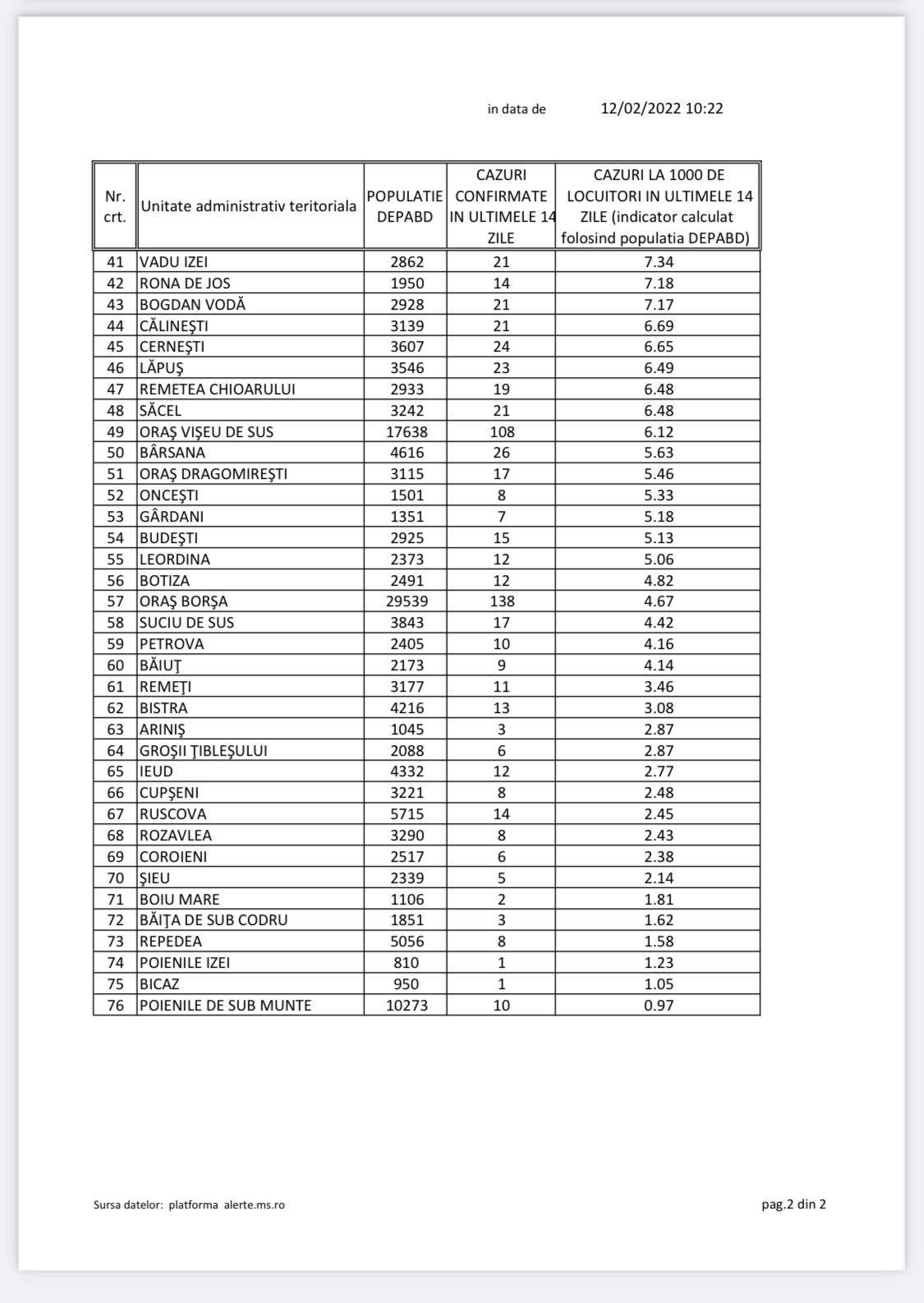 În Maramureș s-au confirmat cazuri în toate cele 76 unități administrativ teritoriale (UAT-uri), iar municipiul Baia Mare se află pe locul 4, dar la mică distanță de primele trei și se află peste pragul de 21 la mie, ceea ce constituie încă o incidență extrem de ridicată. Pe primele cinci locuri în topul incidenței se află respectiv Groși, Coaș, Recea, Baia Mare și Tăuții Măgherăuș. Groși are chiar peste 27 cazuri de COVID-19 la mia de locuitori. Toți indicii sunt în ușoară scădere așadar. Avem în 12 februarie total 62 UAT-uri peste 3 sau egal. Gradul de ocupare al totalului numărului de paturi este de 43,06%, arată statistica DSP Maramureș. Așadar încă vorbim despre un număr ridicat de cazuri atât la nivelul județului Maramureș, cât și la nivelul municipiului Baia Mare, reședința de județ. Ca o precizare, se observă o ușoară tendință de scădere a numărului de cazuri în 14 zile și a incidenței începând din 7 februarie. Vom vedea dacă se menține.