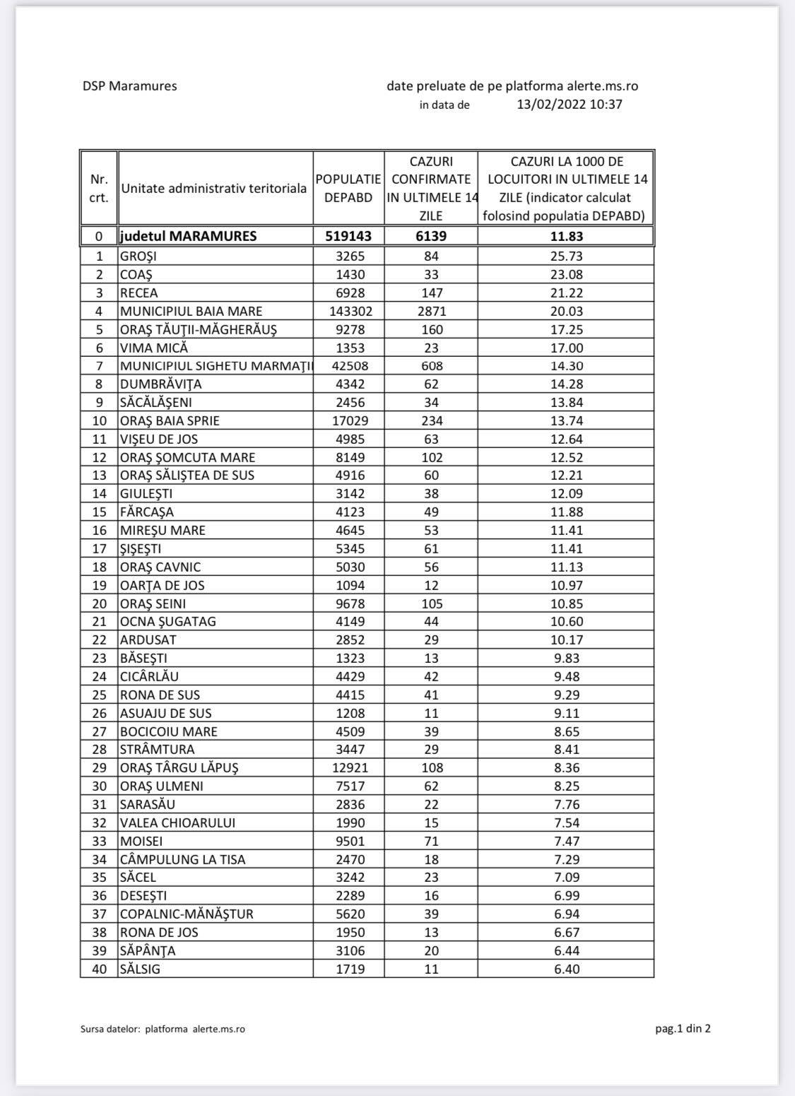 Statistică 13 februarie România: În județul Maramureș evidență nouă a cazurilor în noul val! Total 6139 în interval de 14 zile! Vezi clasamentul pe localități!