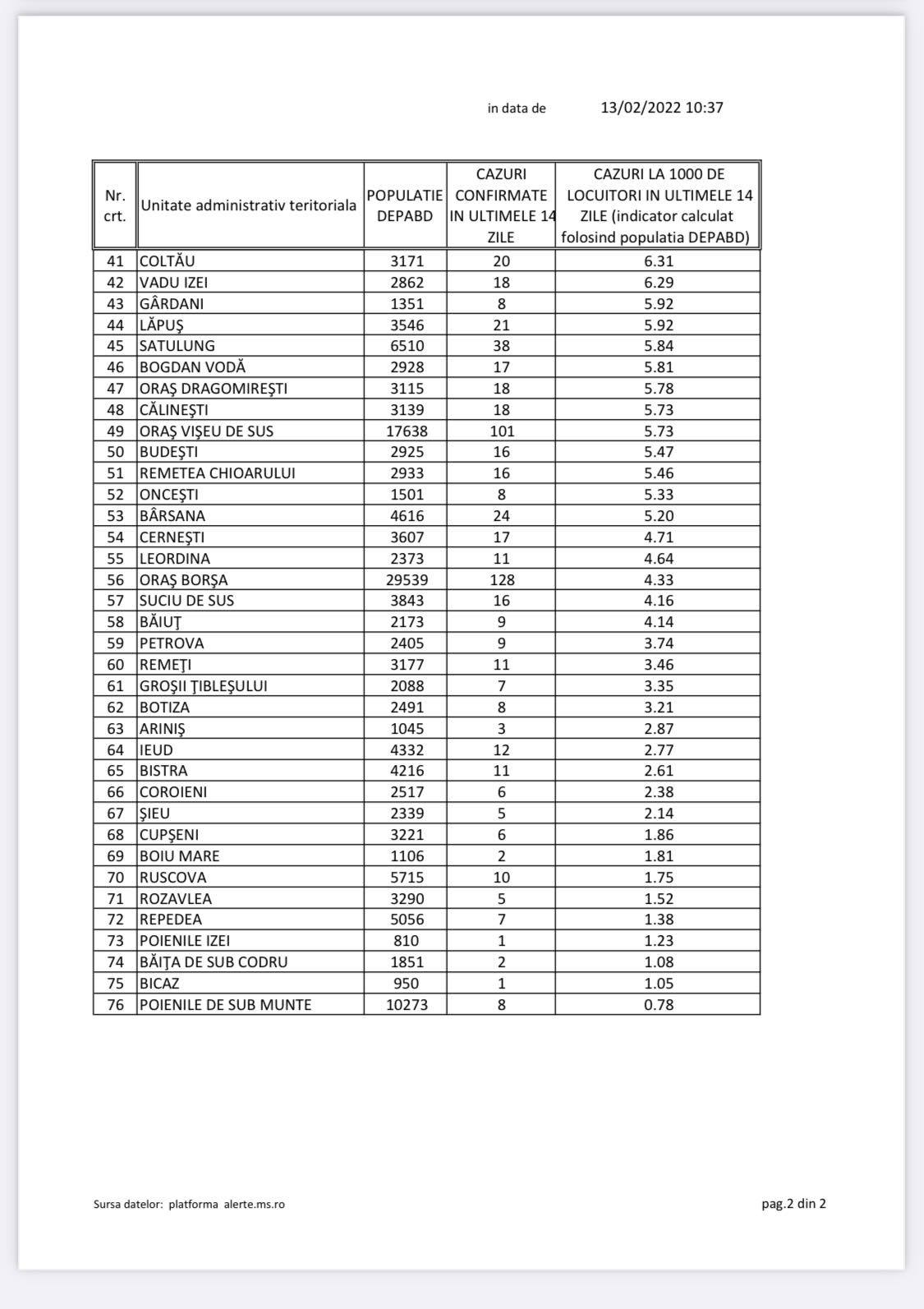 În Maramureș s-au confirmat cazuri în toate cele 76 unități administrativ teritoriale (UAT-uri), iar municipiul Baia Mare se află pe locul 4, dar la mică distanță de primele trei și se află peste pragul de 20 la mie, ceea ce constituie încă o incidență extrem de ridicată. Pe primele cinci locuri în topul incidenței se află respectiv Groși, Coaș, Recea, Baia Mare și Tăuții Măgherăuș. Groși are chiar peste 25 cazuri de COVID-19 la mia de locuitori. Avem în 13 februarie total 62 UAT-uri peste 3 sau egal. Gradul de ocupare al totalului numărului de paturi este de 38,52%, arată statistica DSP Maramureș. Așadar încă vorbim despre un număr ridicat de cazuri atât la nivelul județului Maramureș, cât și la nivelul municipiului Baia Mare, reședința de județ. Ca o precizare, se observă o ușoară tendință de scădere a numărului de cazuri în 14 zile și a incidenței începând din 7 februarie. Vom vedea dacă se menține.