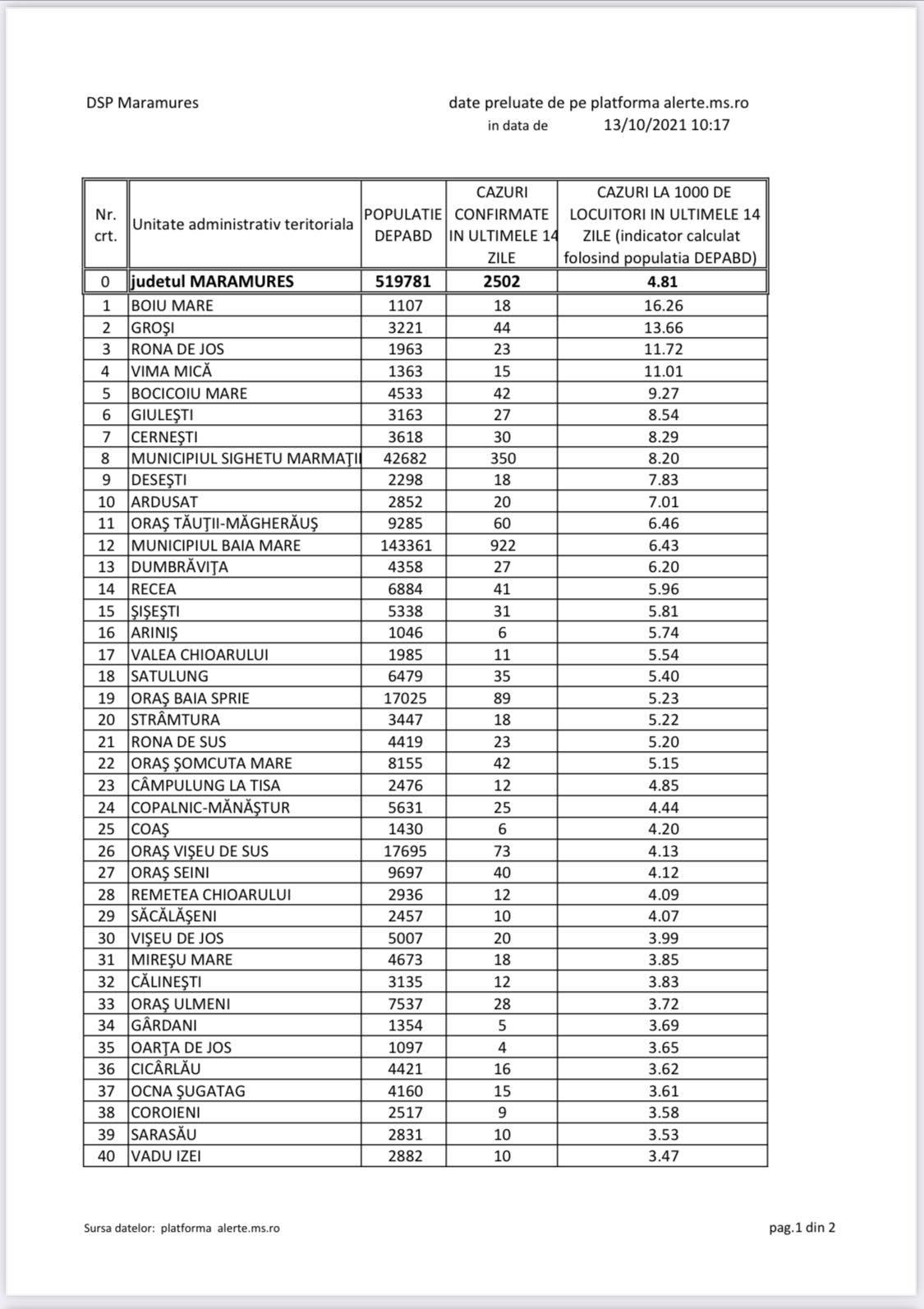 Statistică 13 octombrie România: În județul Maramureș creștere nouă a cazurilor cu noul coronavirus! 2502 în interval de 2 săptămâni! Vezi lista pe localități!