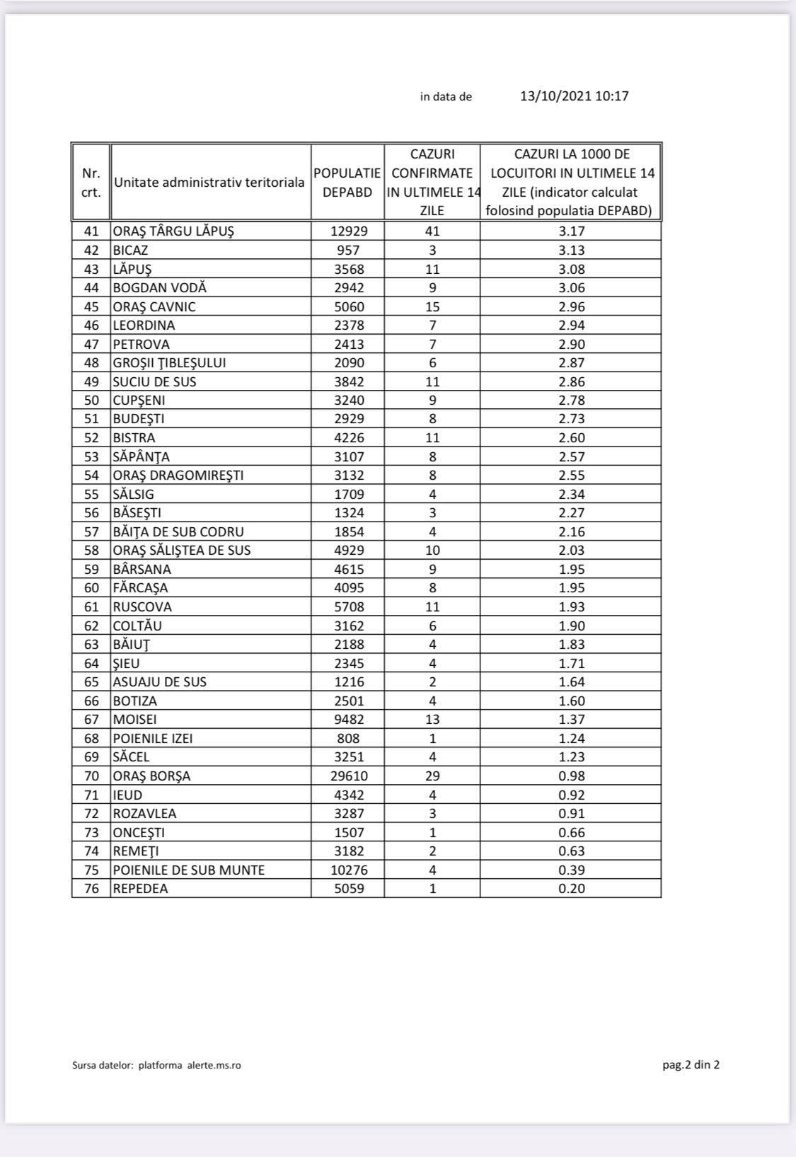 Cu toate acestea reședința de județ are o incidență mult mai mică raportată la mia de locuitori față de celelalte unități administrativ-teritoriale (UAT) care au înregistrat cazuri în aceste două săptămâni. În Maramureș s-au confirmat cazuri în toate cele 76 UAT-uri, și aici existând o creștere considerabilă, iar municipiul Baia Mare se află pe locul 12, din nou, și se află peste pragul de 6 la mie (carantina se introduce la peste 7,5 la mie). Pe primele cinci locuri în topul incidenței se află cinci comune, respectiv Boiu Mare, Groși, Rona de Jos, Vima Mică și Bocicoiu Mare. Avem în 13 octombrie numeroase UAT-uri unde sunt instituite măsuri suplimentare de protecție. Știm că avem 7 UAT-uri carantinate, Giulești (din 22 septembrie cu prelungiri), Recea (din 5 octombrie), Cernești (din 7 octombrie), Rona de Jos și Groși (ambele din 9 octombrie), Bocicoiu Mare (din 12 octombrie), Boiu Mare (din 13 octombrie, ora 19.00) și este posibil să avem și Sighetu Marmației, fie din 13 octombrie, fie din 14 octombrie. Pentru alte UAT-uri cu incidență crescută se vor actualiza măsurile în curând. La cum arată lucrurile putem să ne așteptăm la mai multe situații în intervalul viitor, întrucât tendința este tot de creștere a numărului de cazuri. În prezent, azi avem 9 UAT-uri peste 7,5 (una peste 16, una peste 13, două peste 11, una peste 9, trei peste 8 și una peste 7,5), 4 UAT-uri cu incidența peste 6 dar sub 7,5 (două peste 7 și alte trei peste 6) și încă 31 UAT-uri cu incidența mai mare de 3 dar sub 6 la mie.