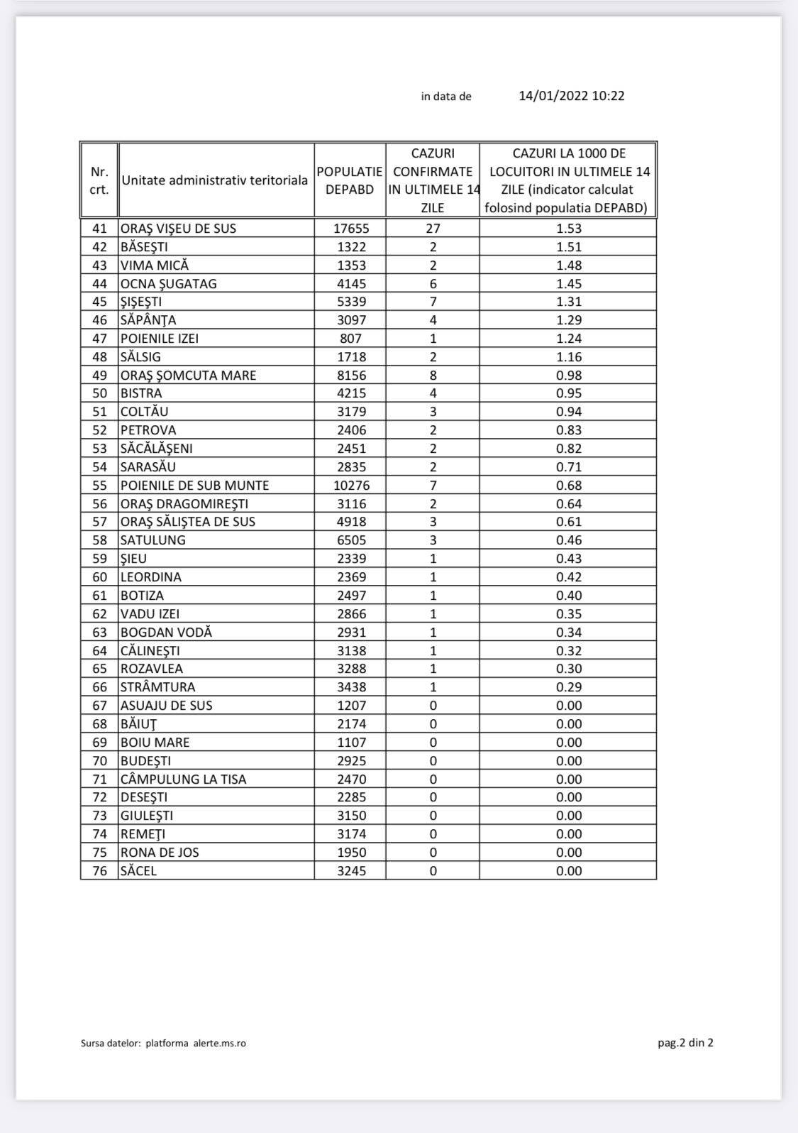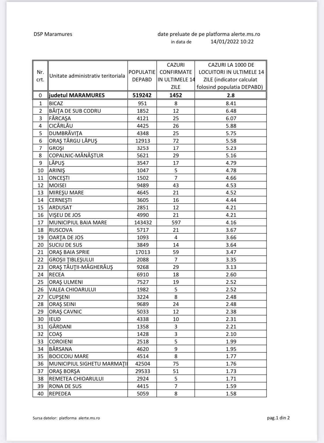 În Maramureș s-au confirmat cazuri în majoritatea celor 76 unități administrativ teritoriale (UAT-uri), în 66 UAT-uri mai exact din total, iar municipiul Baia Mare se află pe locul 17, și se află peste pragul de 4 la mie. Pe primele cinci locuri în topul incidenței se află cinci comune, respectiv Bicaz, Băița de sub Codru, Fărcașa, Cicârlău și Dumbrăvița. Toți indicii sunt în creștere evidentă așadar. Avem în 14 ianuarie 1 UAT cu incidența mai mare de 8 sau egal, 2 UAT-uri cu incidența mai mare de 6 sau egală, 5 UAT-uri cu incidența mai mare de 5 sau egală, 9 UAT-uri cu incidența mai mare de 4 sau egal, 6 UAT-uri cu incidența mai mare de 3 sau egal, 9 UAT-uri cu incidența mai mare de 2 sau egal și 16 UAT-uri cu incidența mai mare de 1 sau egal, restul sunt sub 1.