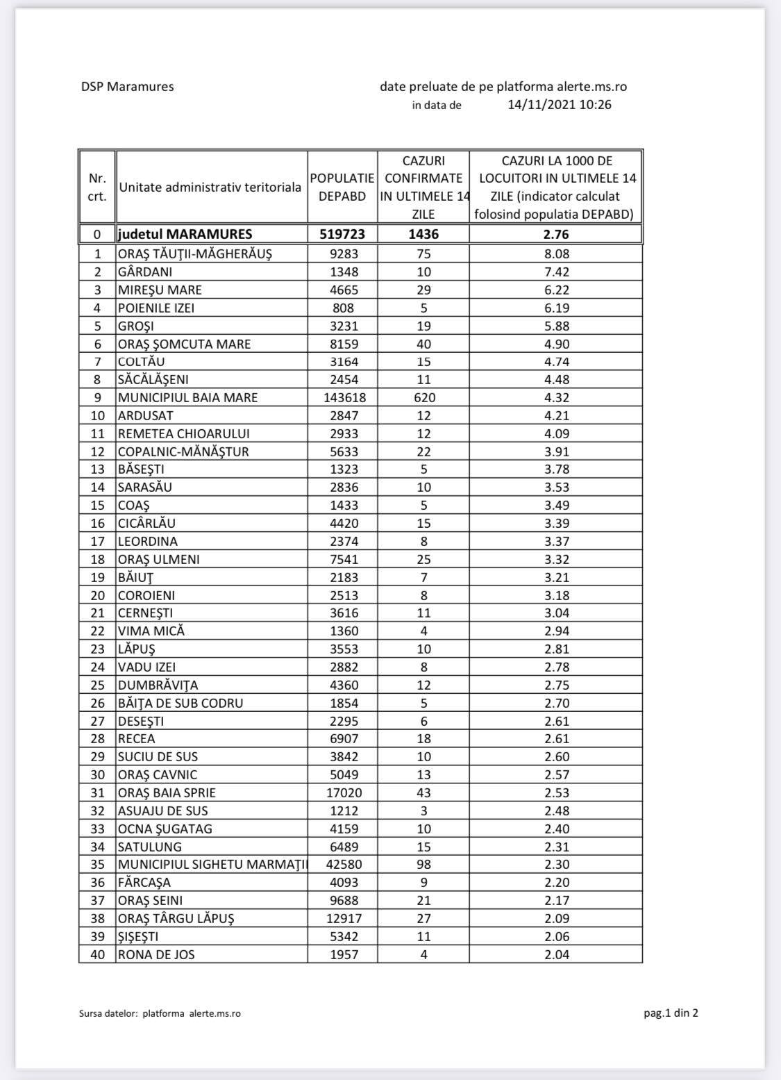 Statistică 14 noiembrie România: În județul Maramureș evidență nouă a cazurilor cu noul coronavirus! 1436 în interval de 2 săptămâni! Vezi lista pe localități!