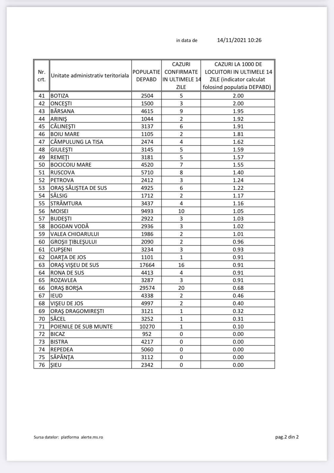 Cu toate acestea reședința de județ are o incidență ceva mai mică raportată la mia de locuitori față de alte unități administrativ-teritoriale (UAT). În Maramureș s-au confirmat cazuri în aproape toate cele 76 UAT-uri (în 71 UAT-uri mai exact, excepții sunt Bicaz, Bistra, Repedea, Săpânța, Șieu), iar municipiul Baia Mare se află pe locul 9, și se află peste pragul de 4 la mie. Pe primele cinci locuri în topul incidenței se află un oraș și patru comune, respectiv Tăuții Măgherăuș, Gârdani, Mireșu Mare, Poienile Izei și Groși. Avem în 14 noiembrie 1 UAT-uri peste sau egal cu 7,5 (una peste 8), 3 UAT-uri cu incidența peste 6 dar sub 7,5 (una peste 7 și două peste 6) și încă 18 UAT-uri cu incidența mai mare sau egală cu 3 dar sub 6 la mie.