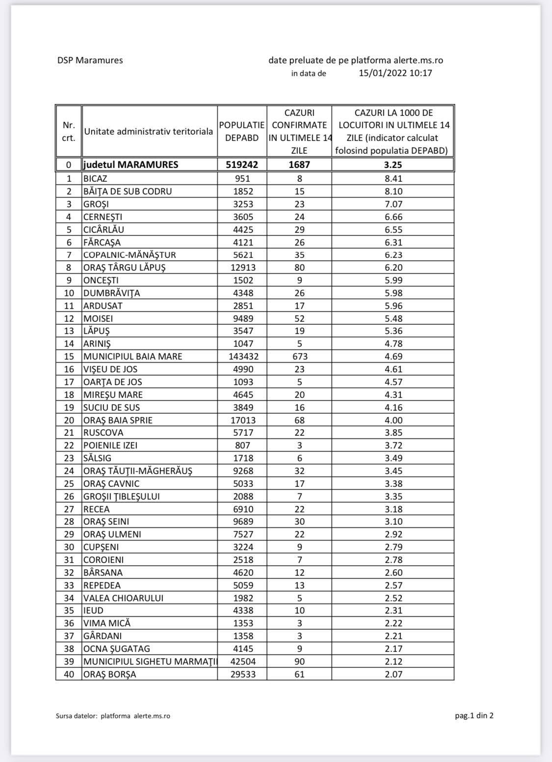 În Maramureș s-au confirmat cazuri în majoritatea celor 76 unități administrativ teritoriale (UAT-uri), în 70 UAT-uri mai exact din total, iar municipiul Baia Mare se află pe locul 15, și se află peste pragul de 4 la mie. Pe primele cinci locuri în topul incidenței se află cinci comune, respectiv Bicaz, Băița de sub Codru, Groși, Cernești și Cicârlău. Toți indicii sunt în creștere evidentă așadar. Avem în 15 ianuarie 2 UAT-uri cu incidența mai mare de 8 sau egal, 1 UAT cu incidența mai mare de 7 sau egal, 5 UAT-uri cu incidența mai mare de 6 sau egală, 5 UAT-uri cu incidența mai mare de 5 sau egală, 7 UAT-uri cu incidența mai mare de 4 sau egal, 8 UAT-uri cu incidența mai mare de 3 sau egal, 12 UAT-uri cu incidența mai mare de 2 sau egal și 11 UAT-uri cu incidența mai mare de 1 sau egal, restul sunt sub 1.