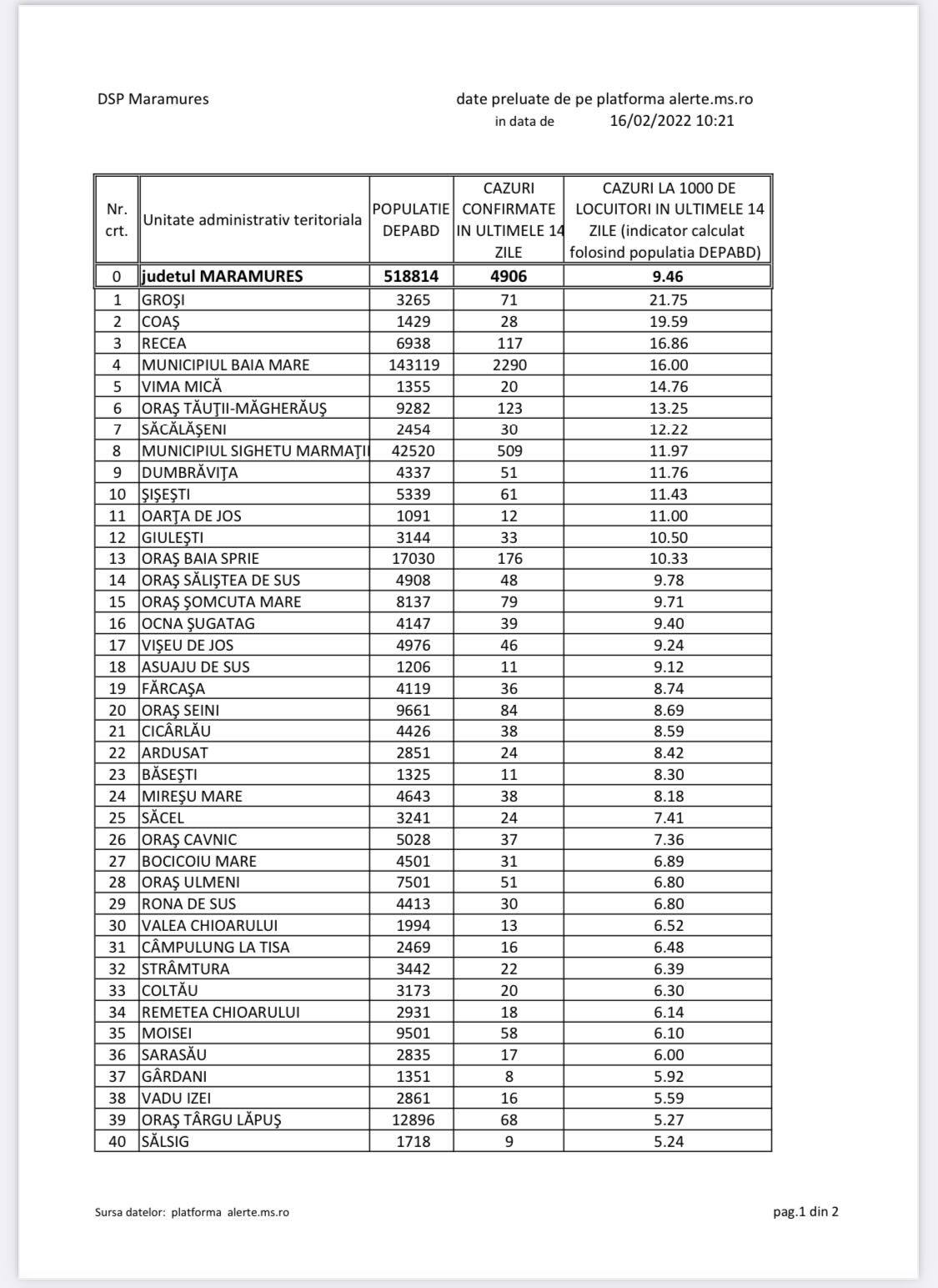 Statistică 16 februarie România: În județul Maramureș evidență nouă a cazurilor în noul val! Total 4906 în interval de 14 zile! Vezi clasamentul pe localități!