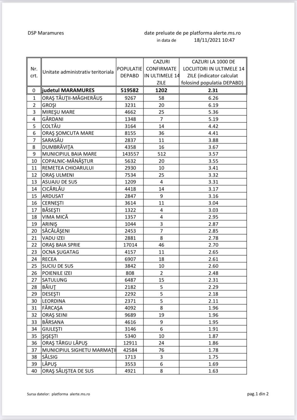 Statistică 18 noiembrie România: În județul Maramureș evidență nouă a cazurilor cu noul coronavirus! 1202 în interval de 2 săptămâni! Vezi lista pe localități!