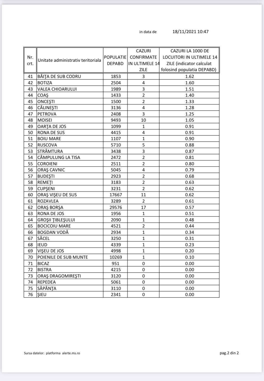 Cu toate acestea reședința de județ are o incidență ceva mai mică raportată la mia de locuitori față de alte unități administrativ-teritoriale (UAT). În Maramureș s-au confirmat cazuri în aproape toate cele 76 UAT-uri (în 70 UAT-uri mai exact, excepții sunt Bicaz, Bistra, Dragomirești, Repedea, Săpânța, Șieu), iar municipiul Baia Mare se află pe locul 9, și se află peste pragul de 3 la mie. Pe primele cinci locuri în topul incidenței se află un oraș și patru comune, respectiv Tăuții Măgherăuș, Groși, Mireșu Mare, Gârdani și Coltău. Avem în 18 noiembrie 2 UAT-uri cu incidența peste 6 dar sub 7,5 (două peste 6) și încă 15 UAT-uri cu incidența mai mare sau egală cu 3 dar sub 6 la mie.