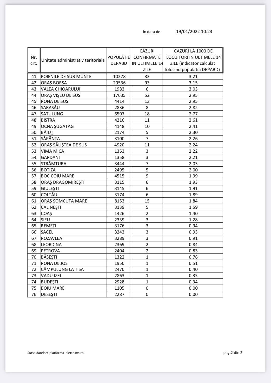 În Maramureș s-au confirmat cazuri în majoritatea celor 76 unități administrativ teritoriale (UAT-uri), în 74 UAT-uri mai exact din total, iar municipiul Baia Mare se află pe locul 13 și se află peste pragul de 7 la mie. Pe primele cinci locuri în topul incidenței se află cinci comune, respectiv Bicaz, Groși, Băița de sub Codru, Sălsig și Ardusat. Toți indicii sunt în creștere evidentă așadar. Avem în 19 ianuarie 1 UAT cu incidența mai mare de 13 sau egal, 3 UAT-uri cu incidența mai mare de 11 sau egal, 1 UAT cu incidența mai mare de 10 sau egal, 1 UAT cu incidență mai mare de 9 sau egal, 5 UAT-uri cu incidența mai mare de 8 sau egal, 6 UAT-uri cu incidența mai mare de 7 sau egal, 5 UAT-uri cu incidența mai mare de 6 sau egală, 6 UAT-uri cu incidența mai mare de 5 sau egală, 4 UAT-uri cu incidența mai mare de 4 sau egal, 11 UAT-uri cu incidența mai mare de 3 sau egal. Total 43 UAT-uri peste 3, restul sunt sub 3. Gradul de ocupare al paturilor este de 17%.