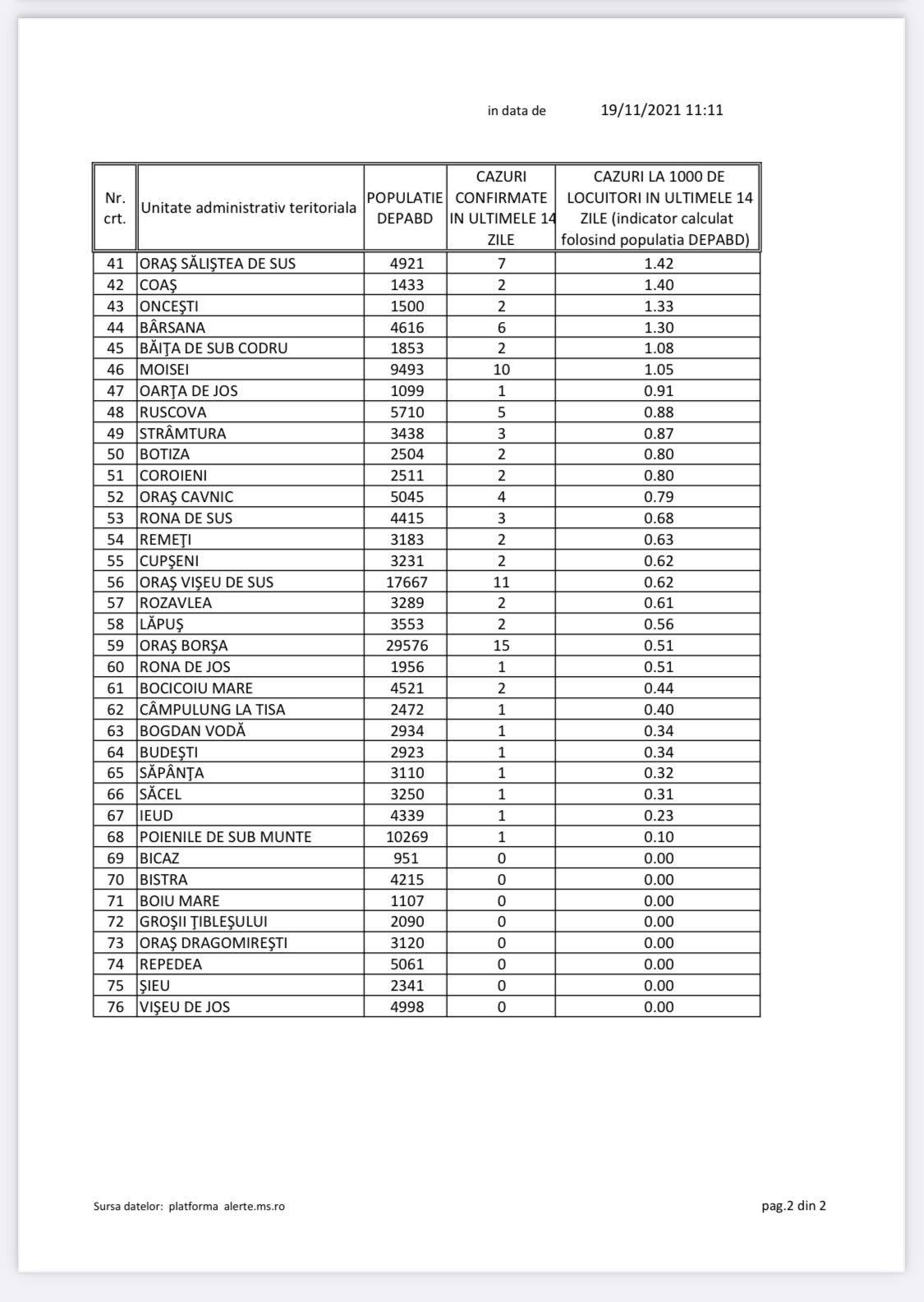 Cu toate acestea reședința de județ are o incidență ceva mai mică raportată la mia de locuitori față de alte unități administrativ-teritoriale (UAT). În Maramureș s-au confirmat cazuri în aproape toate cele 76 UAT-uri (în 68 UAT-uri mai exact, excepții sunt Bicaz, Bistra, Boiu Mare, Dragomirești, Groșii Țibleșului, Repedea, Săpânța, Șieu), iar municipiul Baia Mare se află pe locul 12, și se află peste pragul de 3 la mie. Pe primele cinci locuri în topul incidenței se află un oraș și patru comune, respectiv Tăuții Măgherăuș, Mireșu Mare, Groși, Gârdani și Coltău. Avem în 19 noiembrie 1 UAT cu incidența peste 6 dar sub 7,5 (una peste 6) și încă 14 UAT-uri cu incidența mai mare sau egală cu 3 dar sub 6 la mie.