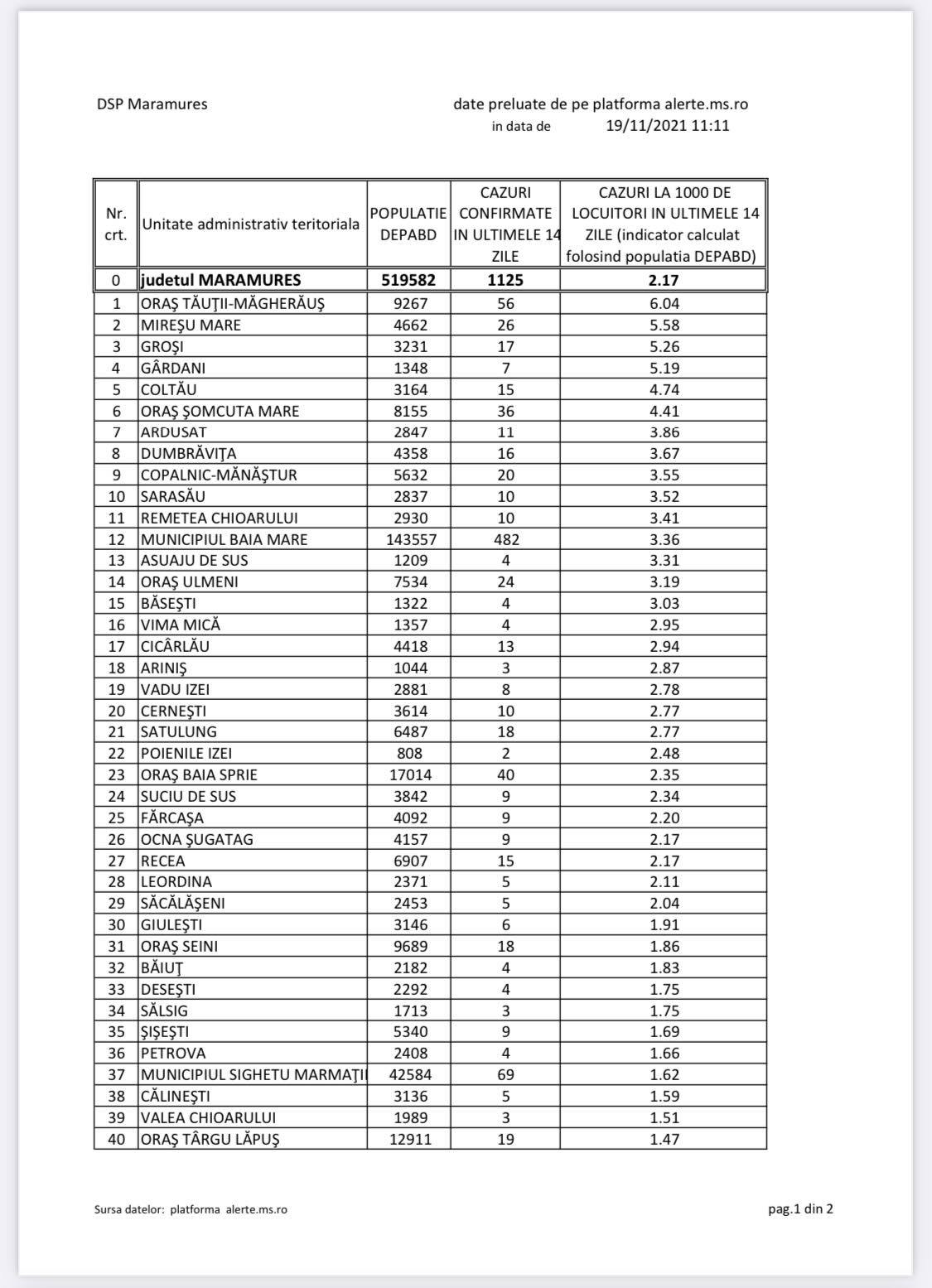 Cu toate acestea reședința de județ are o incidență ceva mai mică raportată la mia de locuitori față de alte unități administrativ-teritoriale (UAT). În Maramureș s-au confirmat cazuri în aproape toate cele 76 UAT-uri (în 68 UAT-uri mai exact, excepții sunt Bicaz, Bistra, Boiu Mare, Dragomirești, Groșii Țibleșului, Repedea, Săpânța, Șieu), iar municipiul Baia Mare se află pe locul 12, și se află peste pragul de 3 la mie. Pe primele cinci locuri în topul incidenței se află un oraș și patru comune, respectiv Tăuții Măgherăuș, Mireșu Mare, Groși, Gârdani și Coltău. Avem în 19 noiembrie 1 UAT cu incidența peste 6 dar sub 7,5 (una peste 6) și încă 14 UAT-uri cu incidența mai mare sau egală cu 3 dar sub 6 la mie.
