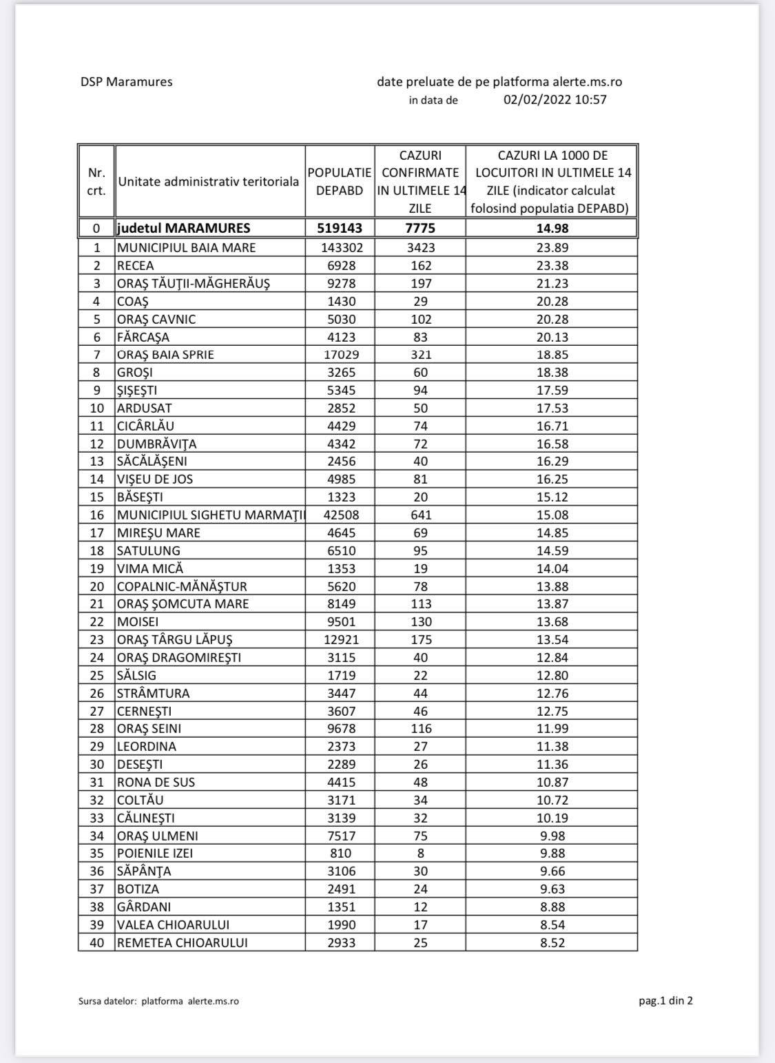 În Maramureș s-au confirmat cazuri în toate cele 76 unități administrativ teritoriale (UAT-uri), iar municipiul Baia Mare se află pe locul 1 pentru prima dată în această pandemie și se află peste pragul de 23 la mie, ceea ce constituie un record absolut pentru cea mai mare așezare în această pandemie. Pe primele cinci locuri în topul incidenței se află respectiv Baia Mare, Recea, Tăuții Măgherăuș, Coaș și Cavnic. Toți indicii sunt în creștere evidentă așadar. Avem în 2 februarie total 73 UAT-uri peste 3, singurele excepții sub 3 fiind Poienile de sub Munte, Groșii Țibșeșului și Boiu Mare. Gradul de ocupare al totalului numărului de paturi este de 52,70%, arată statistica DSP Maramureș. Așadar atât Maramureșul cât și Baia Mare înregistrează astăzi recorduri ale numărului de cazuri în interval de două săptămâni și ale incidenței aferente.