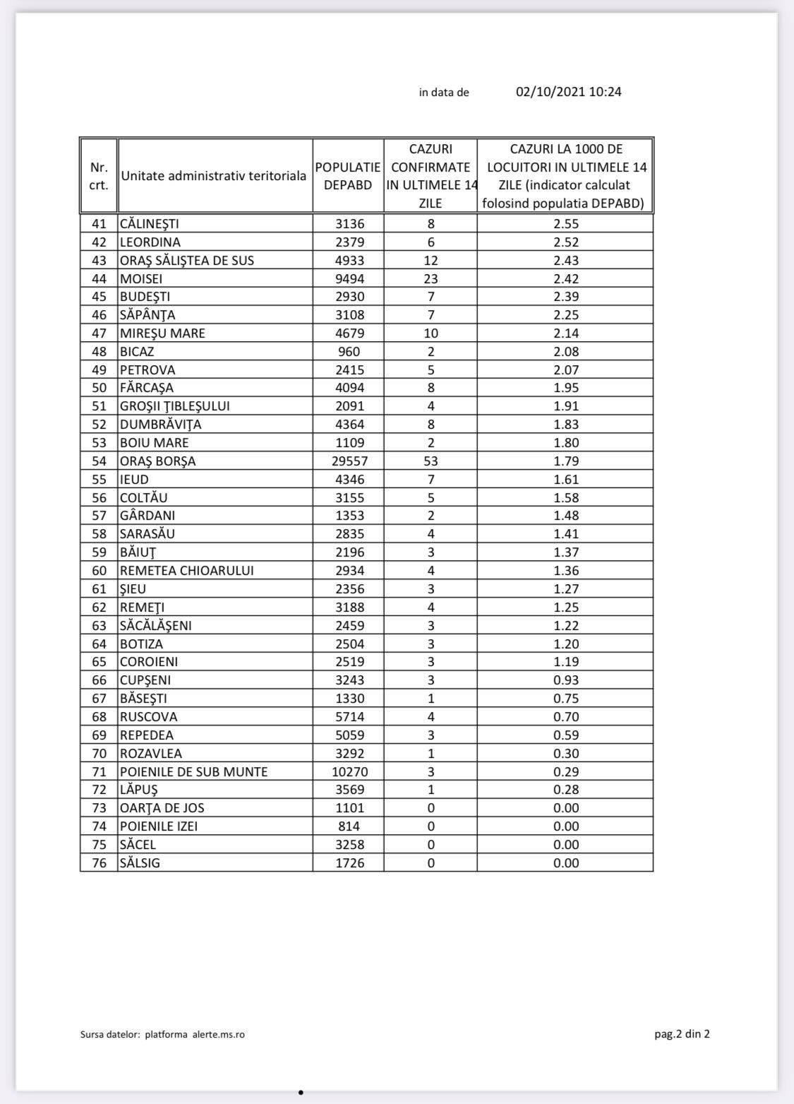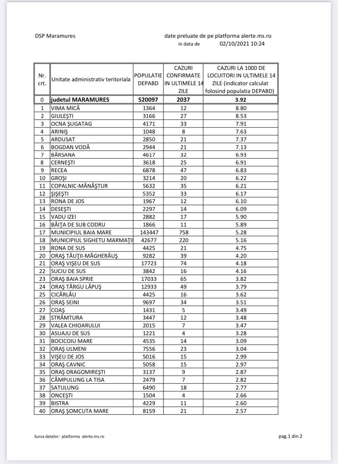 Cu toate acestea reședința de județ are o incidență mult mai mică raportată la mia de locuitori față de celelalte unități administrativ-teritoriale (UAT) care au înregistrat cazuri în aceste două săptămâni. În Maramureș s-au confirmat cazuri în 72 UAT-uri, și aici existând o creștere considerabilă, iar municipiul Baia Mare se află pe locul 17. Pe primele cinci locuri în topul incidenței se află cinci comune, respectiv Vima Mică, Giulești, Ocna Șugatag, Ariniș și Ardusat. Avem în 2 octombrie 29 UAT-uri unde sunt instituite măsuri suplimentare de protecție iar aici ne referim la cele 2 UAT-uri, Bârsana și Giulești, care sunt carantinate, respectiv încă 3 UAT care sunt semicarantinate, deci cu măsuri mai drastice, Bogdan Vodă, Vima Mică și Ocna Șugatag, dar și alte 24 UAT-uri, care au incidența mai mare de 3 la mie, Baia Sprie, Vadu Izei, Suciu de Sus, Groși, Rona de Sus, Târgu Lăpuș, Seini, Cernești, Valea Chioarului, Cicârlău, Tăuții Măgherăuș, Vișeu de Jos, Sighetu Marmației, Șișești, Moisei, Ardusat, Baia Mare, Călinești, Rona de Jos, Băița de Sub Codru, Recea, Copalnic Mănăștur și Vișeu de Sus. Cifrele luate în considerare sunt cele de sâmbătă, 25 septembrie, astfel că s-au instituit restricții suplimentare la cea mai recentă ședință de CJSU Maramureș. La cum arată lucrurile putem să ne așteptăm la mai multe situații în intervalul viitor, întrucât tendința este tot de creștere a numărului de cazuri. În prezent, azi avem 4 UAT-uri peste 7,5 (două peste 8 și două peste 7,5), 10 UAT-uri cu incidența peste 6 dar sub 7,5 (două peste 7, opt peste 6) și încă 18 UAT-uri cu incidența mai mare de 3 dar sub 6 la mie.