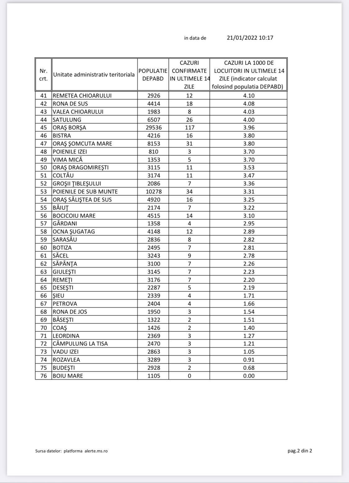 În Maramureș s-au confirmat cazuri în majoritatea celor 76 unități administrativ teritoriale (UAT-uri), în 75 UAT-uri mai exact din total (singura excepție, Boiu Mare), iar municipiul Baia Mare se află pe locul 10 și se află peste pragul de 10 la mie. Pe primele cinci locuri în topul incidenței se află cinci comune, respectiv Sălsig, Bicaz, Groși, Băița de sub Codru și Ruscova. Toți indicii sunt în creștere evidentă așadar. Avem în 21 ianuarie 1 UAT cu incidența mai mare de 16 sau egal, 1 UAT cu incidența mai mare de 13 sau egal, 2 UAT-uri cu incidența mai mare de 12 sau egal, 4 UAT-uri cu incidența mai mare de 11 sau egal, 3 UAT-uri cu incidența mai mare de 10 sau egal, 3 UAT-uri cu incidență mai mare de 9 sau egal, 3 UAT-uri cu incidența mai mare de 8 sau egal, 6 UAT-uri cu incidența mai mare de 7 sau egal, 3 UAT-uri cu incidența mai mare de 6 sau egală, 4 UAT-uri cu incidența mai mare de 5 sau egală, 14 UAT-uri cu incidența mai mare de 4 sau egal, 12 UAT-uri cu incidența mai mare de 3 sau egal. Total 56 UAT-uri peste 3, restul sunt sub 3. Gradul de ocupare al paturilor este de 17%.