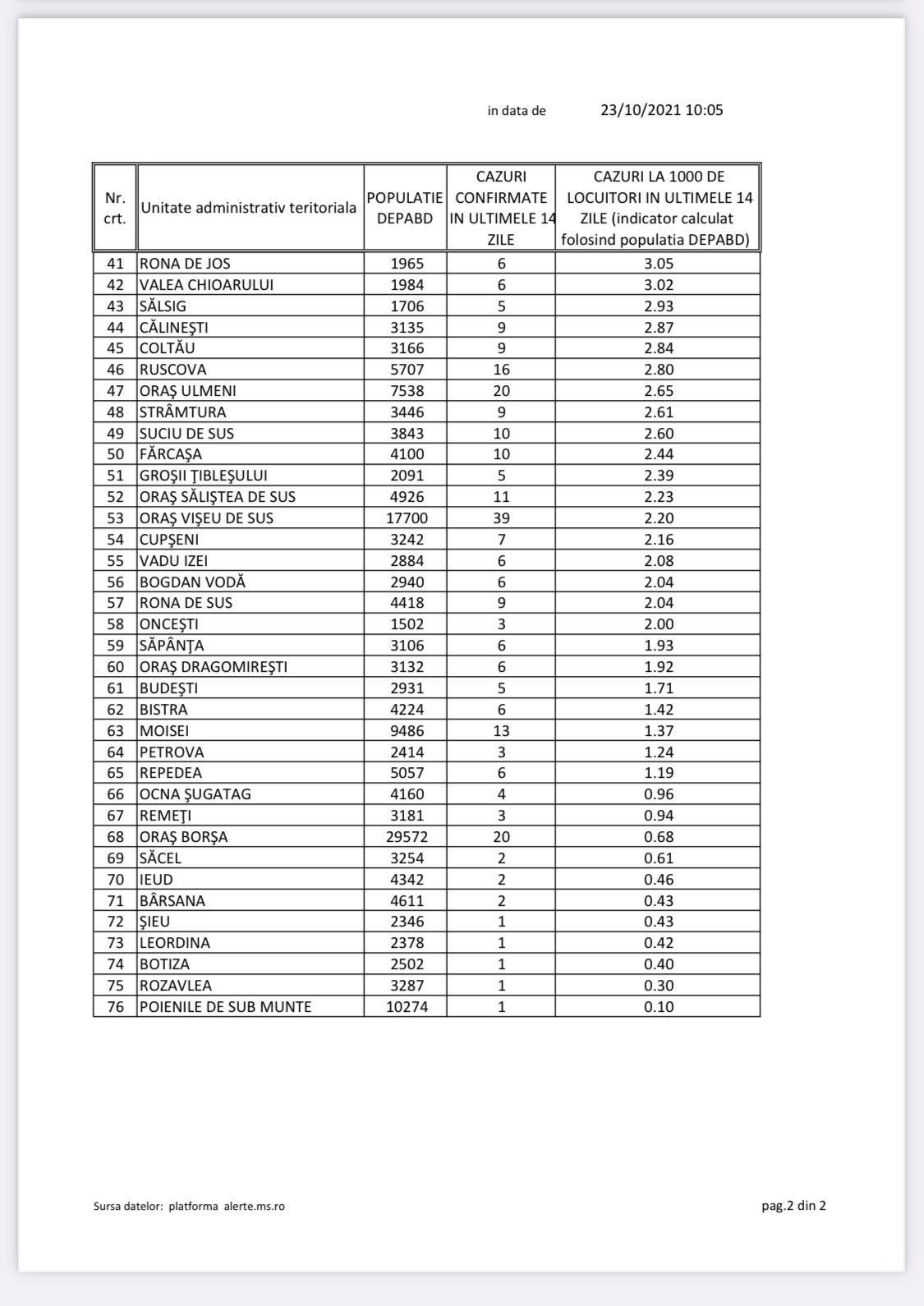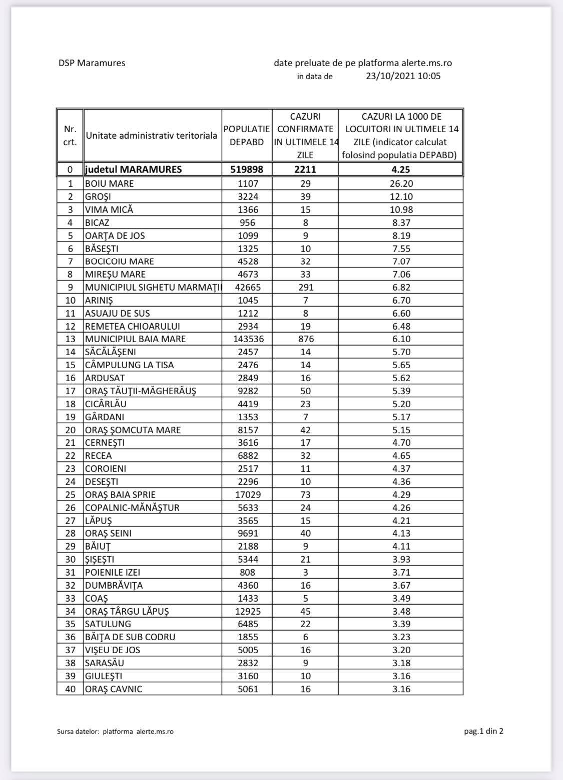 Cu toate acestea reședința de județ are o incidență ceva mai mică raportată la mia de locuitori față de alte unități administrativ-teritoriale (UAT). În Maramureș s-au confirmat cazuri în toate cele 76 UAT-uri, iar municipiul Baia Mare se află pe locul 13, din nou, și se află peste pragul de 6 la mie (carantina se introduce la peste 7,5 la mie). Pe primele cinci locuri în topul incidenței se află cinci comune, respectiv Boiu Mare, Groși, Vima Mică, Bicaz și Oarța de Jos. Avem în 23 octombrie numeroase UAT-uri unde sunt instituite măsuri suplimentare de protecție. Știm că avem 5 UAT-uri carantinate, Rona de Jos (din 9 octombrie), Bocicoiu Mare (din 12 octombrie), Boiu Mare (din 13 octombrie), Sighetu Marmației (din 14 octombrie), Vima Mică (din 15 octombrie), dar care vor ieși treptat la expirarea celor două săptămâni, ca urmare a măsurilor instituite la nivel național. Azi avem 6 UAT-uri peste 7,5 (una peste 26 – record județean!, una peste 12, una peste 10, două peste 8 și una peste 7,5), 7 UAT-uri cu incidența peste 6 dar sub 7,5 (două peste 7 și alte cinci peste 6) și încă 29 UAT-uri cu incidența mai mare de 3 dar sub 6 la mie.