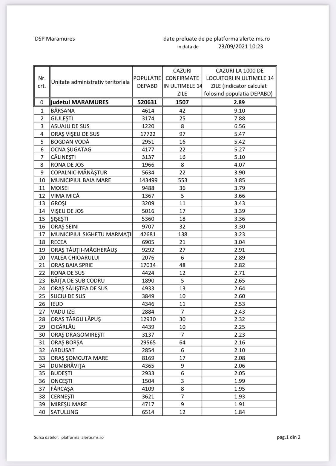 Cu toate acestea reședința de județ are o incidență mult mai mică raportată la mia de locuitori față de celelalte unități administrativ-teritoriale (UAT) care au înregistrat cazuri în aceste două săptămâni. În Maramureș s-au confirmat cazuri în 70 UAT-uri, și aici existând o creștere considerabilă, iar municipiul Baia Mare se află pe locul 10. Pe primele cinci locuri în topul incidenței se află patru comune și un oraș, respectiv Bârsana, Giulești, Asuaju de Sus, Vișeu de Sus, Bogdan Vodă. Avem în 23 septembrie 16 UAT-uri unde sunt instituite măsuri suplimentare de protecție iar aici ne referim la cele 3, Bârsana, Asuaju de Sus și Giulești, care sunt carantinate, respectiv încă 13 UAT-uri, Vima Mică, Groși, Copalnic Mănăștur, Seini, Baia Mare, Moisei, Șișești, Vișeu de Jos, Rona de Jos, Ocna Șugatag, Bogdan Vodă, Călinești și Vișeu de Sus, unde incidența este crescută, astfel că s-au instituit restricții suplimentare la cea mai recentă ședință de CJSU Maramureș. La cum arată lucrurile putem să ne așteptăm la mai multe situații în intervalul viitor, întrucât tendința este tot de creștere a numărului de cazuri. În prezent, avem 3 UAT-uri cu incidența peste 6 (una peste 9, una peste 7, una peste 6) și încă 15 UAT-uri cu incidența mai mare de 3, dar sub 6 la mie.