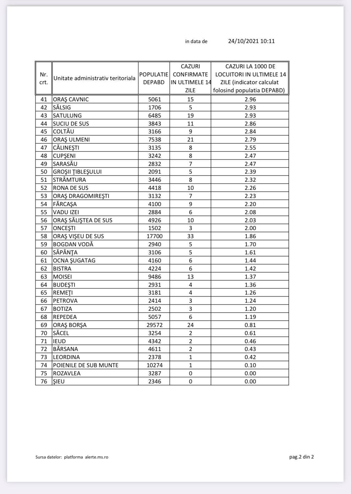 Cu toate acestea reședința de județ are o incidență ceva mai mică raportată la mia de locuitori față de alte unități administrativ-teritoriale (UAT). În Maramureș s-au confirmat cazuri în aproape toate cele 76 UAT-uri (în 74 UAT-uri mai exact, excepții sunt Rozavlea și Șieu), iar municipiul Baia Mare se află pe locul 12, din nou, și se află peste pragul de 6 la mie (carantina se introduce la peste 7,5 la mie). Pe primele cinci locuri în topul incidenței se află cinci comune, respectiv Boiu Mare, Bicaz, Groși, Vima Mică și Oarța de Jos. Avem în 24 octombrie numeroase UAT-uri unde sunt instituite măsuri suplimentare de protecție. Știm că avem 4 UAT-uri carantinate, Bocicoiu Mare (din 12 octombrie), Boiu Mare (din 13 octombrie), Sighetu Marmației (din 14 octombrie), Vima Mică (din 15 octombrie), dar care vor ieși treptat la expirarea celor două săptămâni, ca urmare a măsurilor instituite la nivel național. Azi avem 6 UAT-uri peste 7,5 (una peste 21, două peste 12, una peste 10, una peste 8 și una peste 7,5), 6 UAT-uri cu incidența peste 6 dar sub 7,5 (una peste 7 și alte cinci peste 6) și încă 28 UAT-uri cu incidența mai mare de 3 dar sub 6 la mie.