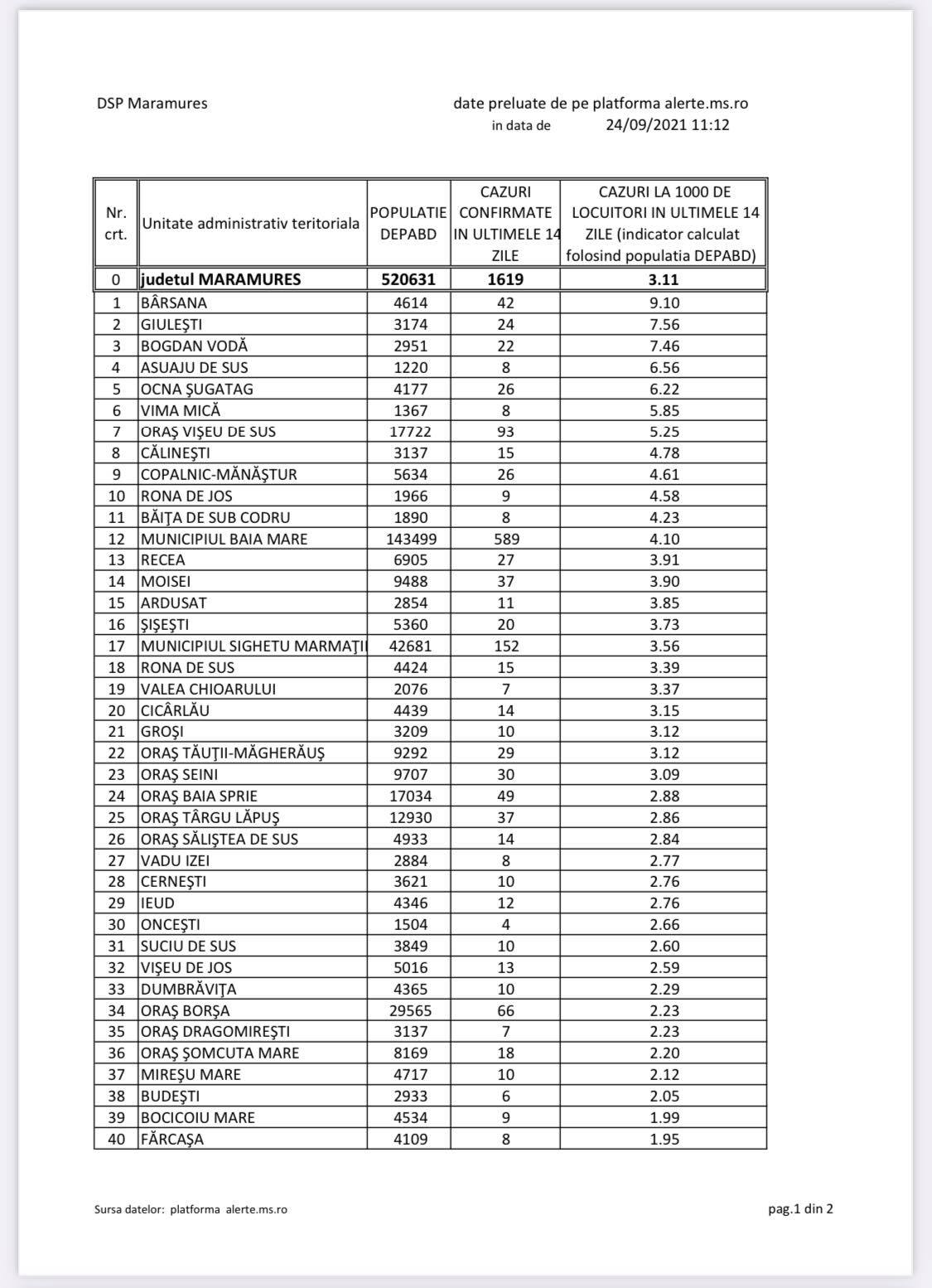 Cu toate acestea reședința de județ are o incidență mult mai mică raportată la mia de locuitori față de celelalte unități administrativ-teritoriale (UAT) care au înregistrat cazuri în aceste două săptămâni. În Maramureș s-au confirmat cazuri în 71 UAT-uri, și aici existând o creștere considerabilă, iar municipiul Baia Mare se află pe locul 12. Pe primele cinci locuri în topul incidenței se află cinci comune, respectiv Bârsana, Giulești, Bogdan Vodă, Asuaju de Sus și Ocna Șugatag. Azi Bârsana este pe locul 5 în țară la nivel național după Cătina – 12,08 şi Ploşcoş – 9,66, ambele din judeţul Cluj, Şeica Mică (judeţul Sibiu) – 9,48, Pojejena (judeţul Caraş Severin) – 9,47 și este urmată de Bara (judeţul Timiş) – 9,06 şi Gura Vadului (judeţul Prahova) – 8,75. Avem în 24 septembrie 16 UAT-uri unde sunt instituite măsuri suplimentare de protecție iar aici ne referim la cele 3, Bârsana, Asuaju de Sus și Giulești, care sunt carantinate, respectiv încă 13 UAT-uri, Vima Mică, Groși, Copalnic Mănăștur, Seini, Baia Mare, Moisei, Șișești, Vișeu de Jos, Rona de Jos, Ocna Șugatag, Bogdan Vodă, Călinești și Vișeu de Sus, unde incidența este crescută, astfel că s-au instituit restricții suplimentare la cea mai recentă ședință de CJSU Maramureș. La cum arată lucrurile putem să ne așteptăm la mai multe situații în intervalul viitor, întrucât tendința este tot de creștere a numărului de cazuri. În prezent, avem 5 UAT-uri cu incidența peste 6 (una peste 9, două peste 7, două peste 6) și încă 18 UAT-uri cu incidența mai mare de 3, dar sub 6 la mie.