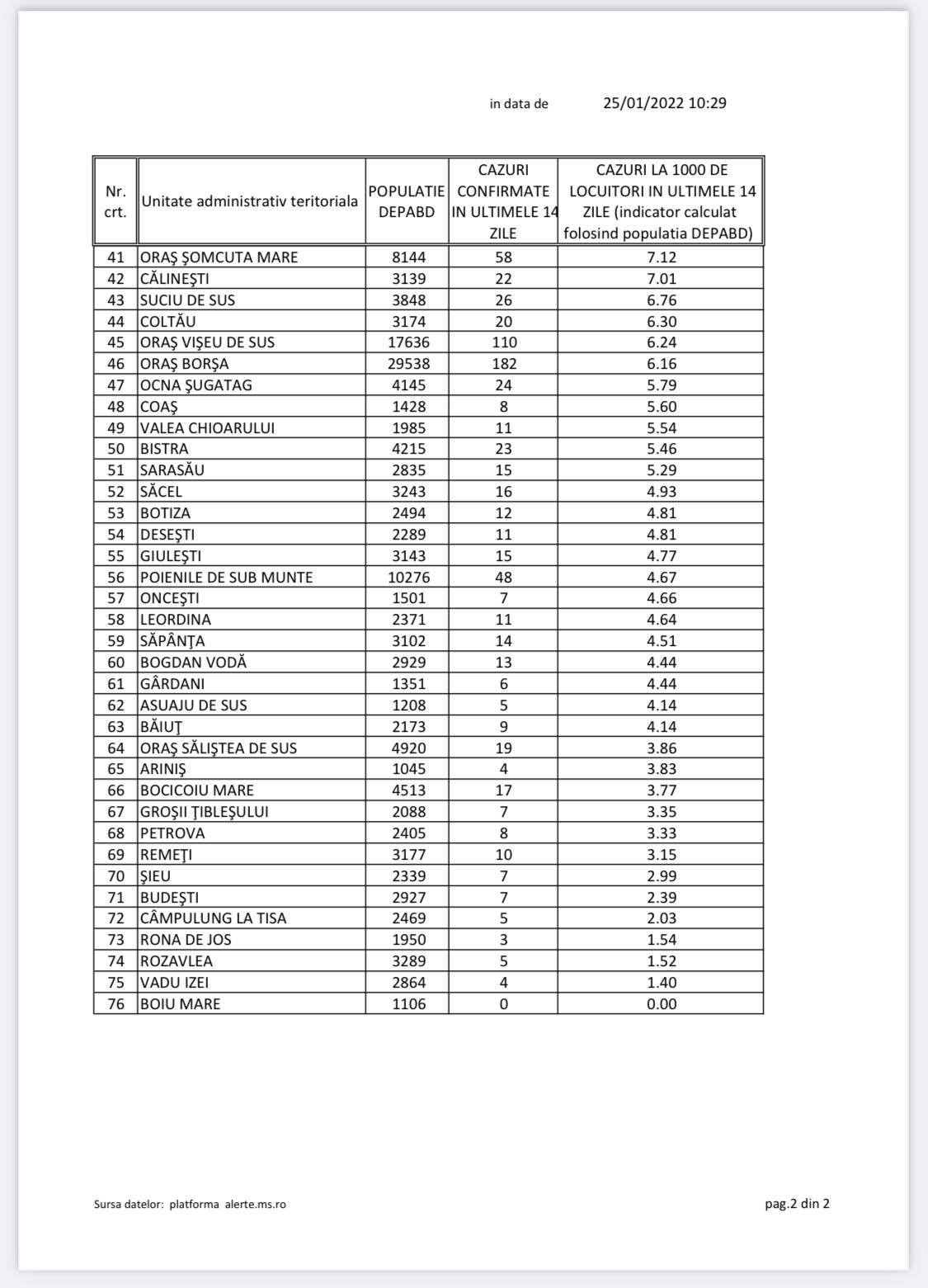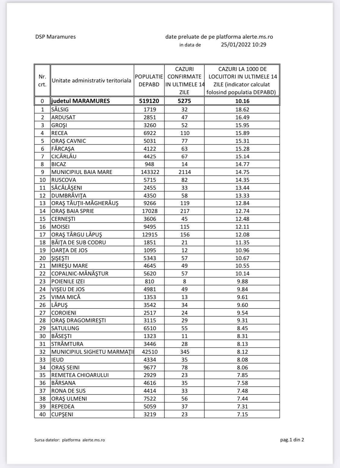 În Maramureș s-au confirmat cazuri în majoritatea celor 76 unități administrativ teritoriale (UAT-uri), în 75 UAT-uri mai exact din total (singura excepție, Boiu Mare), iar municipiul Baia Mare se află pe locul 9 și se află peste pragul de 14 la mie. Pe primele cinci locuri în topul incidenței se află patru comune și un oraș, respectiv Sălsig, Ardusat, Groși, Recea și Cavnic. Toți indicii sunt în creștere evidentă așadar. Avem în 25 ianuarie 1 UAT cu incidența mai mare de 18 sau egală, 1 UAT cu incidența mai mare de 16 sau egală, 5 UAT-uri cu incidența mai mare de 15 sau egală, 3 UAT-uri cu incidența mai mare de 14 sau egală, 2 UAT-uri cu incidența mai mare de 13 sau egală, 5 UAT-uri cu incidența mai mare de 12 sau egală, 1 UAT cu incidența mai mare de 11 sau egală, 4 UAT-uri cu incidența mai mare de 10 sau egală, 6 UAT-uri cu incidență mai mare de 9 sau egală, 6 UAT-uri cu incidența mai mare de 8 sau egală, 8 UAT-uri cu incidența mai mare de 7 sau egală, 4 UAT-uri cu incidența mai mare de 6 sau egală, 5 UAT-uri cu incidența mai mare de 5 sau egală, 12 UAT-uri cu incidența mai mare de 4 sau egală, 6 UAT-uri cu incidența mai mare de 3 sau egal. Total 69 UAT-uri peste 3, restul sunt sub 3. Gradul de ocupare al paturilor este de 17%.