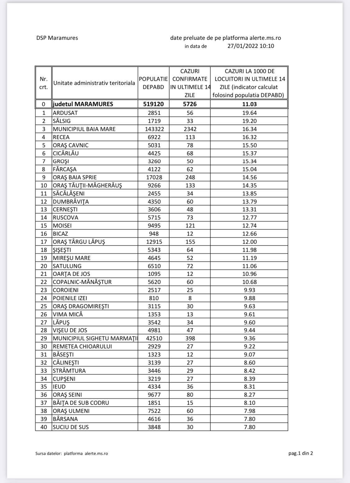 Pentru prima dată municipiul Baia Mare urcă pe podimul din județ. În Maramureș s-au confirmat cazuri în toate cele 76 unități administrativ teritoriale (UAT-uri), iar municipiul Baia Mare se află pe locul 3 și se află peste pragul de 16 la mie, ceea ce constituie un record absolut pentru cea mai mare așezare în această pandemie. Pe primele cinci locuri în topul incidenței se află respectiv Ardusat, Sălsig, Baia Mare, Recea și Cavnic. Toți indicii sunt în creștere evidentă așadar. Avem în 27 ianuarie total 73 UAT-uri peste 3, singurele excepții sub 3 fiind Câmpulung la Tisa, Rozavlea, Boiu Mare. Gradul de ocupare al paturilor este de 17%, arată statistica DSP Maramureș. Așadar atât Maramureșul cât și Baia Mare înregistrează astăzi recorduri ale numărului de cazuri și ale incidenței aferente.