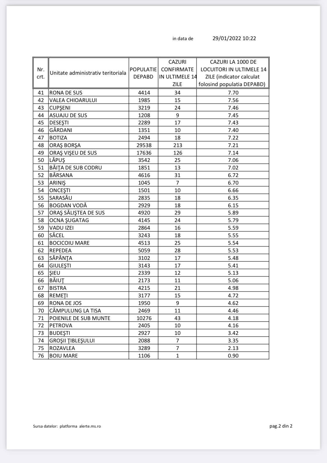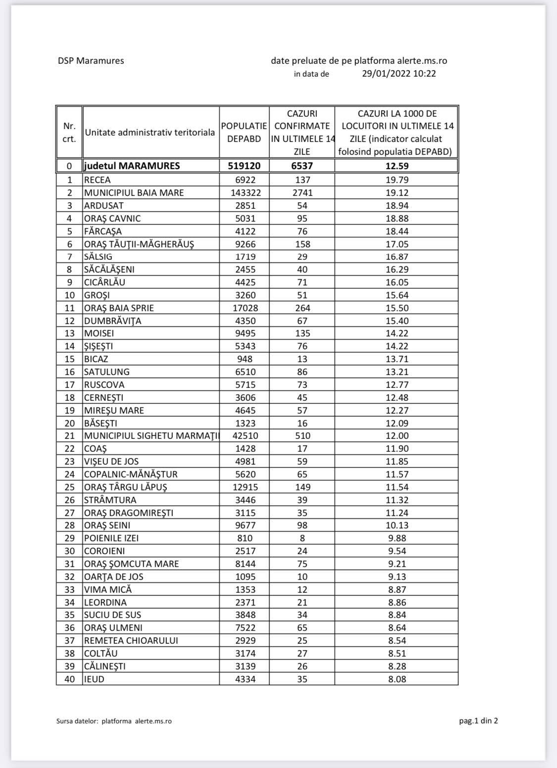 În Maramureș s-au confirmat cazuri în toate cele 76 unități administrativ teritoriale (UAT-uri), iar municipiul Baia Mare se află pe locul 2 pentru prima dată în această pandemie și se află peste pragul de 19 la mie, ceea ce constituie un record absolut pentru cea mai mare așezare în această pandemie. Pe primele cinci locuri în topul incidenței se află respectiv Recea, Baia Mare, Ardusat, Cavnic și Fărcașa. Toți indicii sunt în creștere evidentă așadar. Avem în 29 ianuarie total 74 UAT-uri peste 3, singurele excepții sub 3 fiind Rozavlea și Boiu Mare. Gradul de ocupare al totalului numărului de paturi este de 52,70%, arată statistica DSP Maramureș, semn că autoritățile au actualizat datele pe acest segment. Așadar atât Maramureșul cât și Baia Mare înregistrează astăzi recorduri ale numărului de cazuri în interval de două săptămâni și ale incidenței aferente.