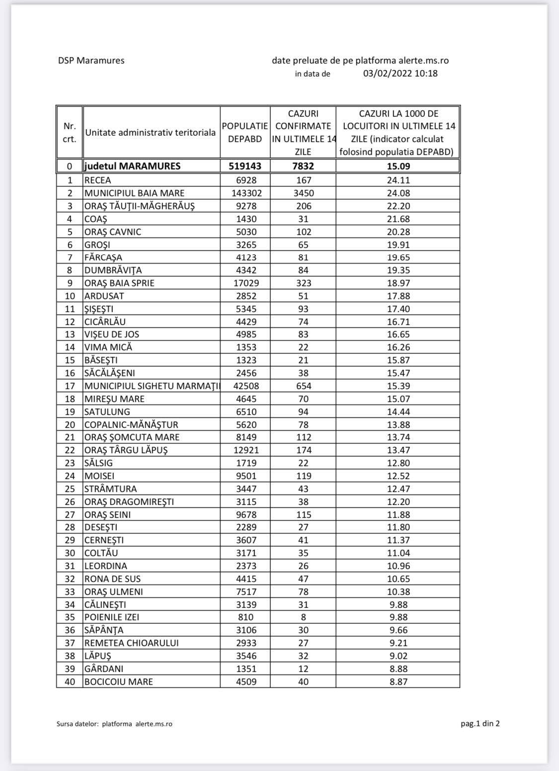 În Maramureș s-au confirmat cazuri în toate cele 76 unități administrativ teritoriale (UAT-uri), iar municipiul Baia Mare se află pe locul 2 după comuna Recea, dar la mică distanță și se află peste pragul de 24 la mie, ceea ce constituie un record absolut pentru cea mai mare așezare în această pandemie. Pe primele cinci locuri în topul incidenței se află respectiv Recea, Baia Mare, Tăuții Măgherăuș, Coaș și Cavnic. Toți indicii sunt în creștere evidentă așadar. Avem în 3 februarie total 73 UAT-uri peste 3, singurele excepții sub 3 fiind Poienile de sub Munte, Groșii Țibșeșului și Boiu Mare. Gradul de ocupare al totalului numărului de paturi este de 52,70%, arată statistica DSP Maramureș. Așadar atât Maramureșul cât și Baia Mare înregistrează astăzi recorduri ale numărului de cazuri în interval de două săptămâni și ale incidenței aferente.