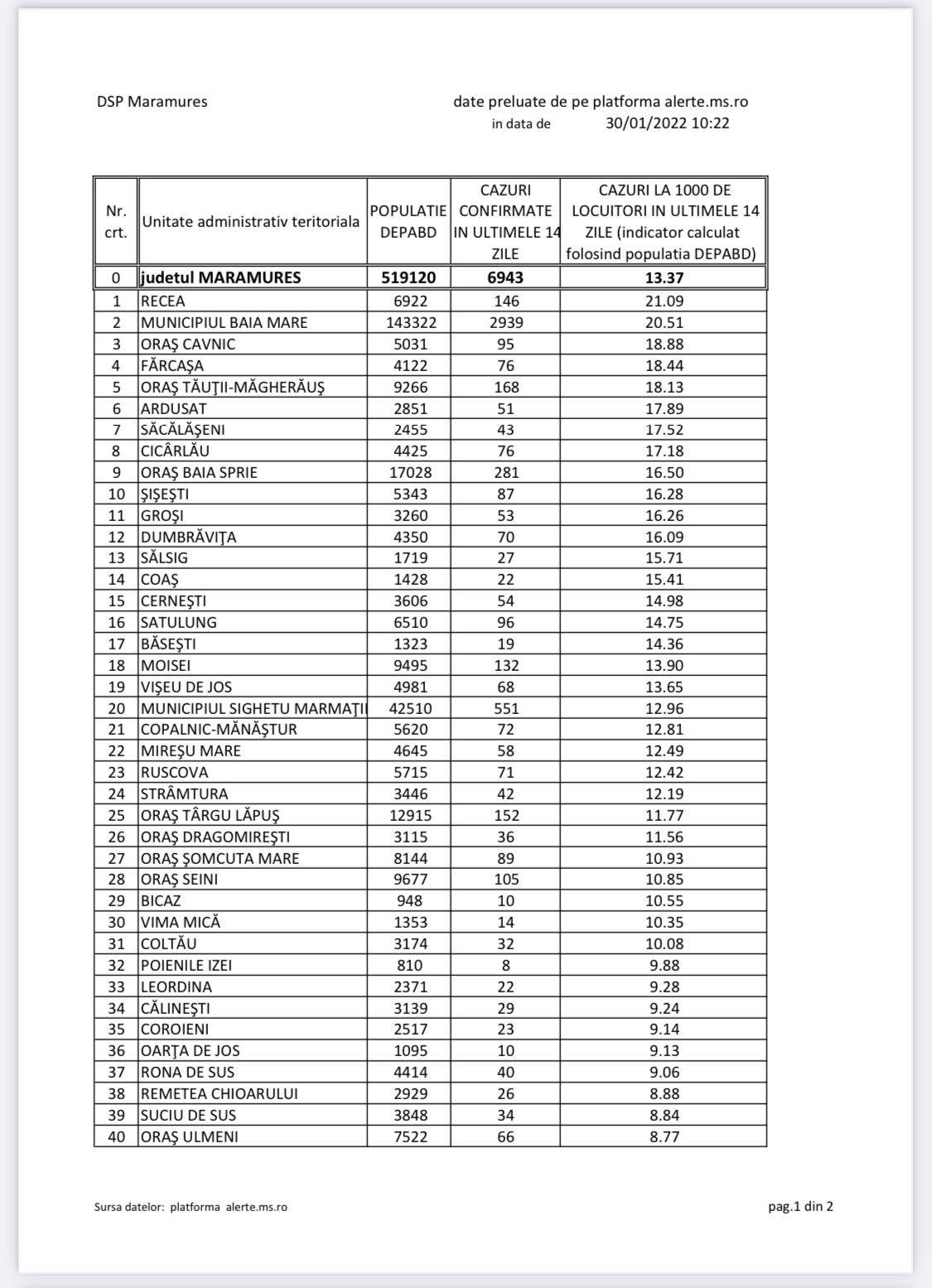 În Maramureș s-au confirmat cazuri în toate cele 76 unități administrativ teritoriale (UAT-uri), iar municipiul Baia Mare se află pe locul 2 pentru prima dată în această pandemie și se află peste pragul de 20 la mie, ceea ce constituie un record absolut pentru cea mai mare așezare în această pandemie. Pe primele cinci locuri în topul incidenței se află respectiv Recea, Baia Mare, Cavnic, Fărcașa, Tăuții Măgherăuș. Toți indicii sunt în creștere evidentă așadar. Avem în 30 ianuarie total 74 UAT-uri peste 3, singurele excepții sub 3 fiind Groșii Țibșeșului și Boiu Mare. Gradul de ocupare al totalului numărului de paturi este de 52,70%, arată statistica DSP Maramureș, semn că autoritățile au actualizat datele pe acest segment. Așadar atât Maramureșul cât și Baia Mare înregistrează astăzi recorduri ale numărului de cazuri în interval de două săptămâni și ale incidenței aferente.