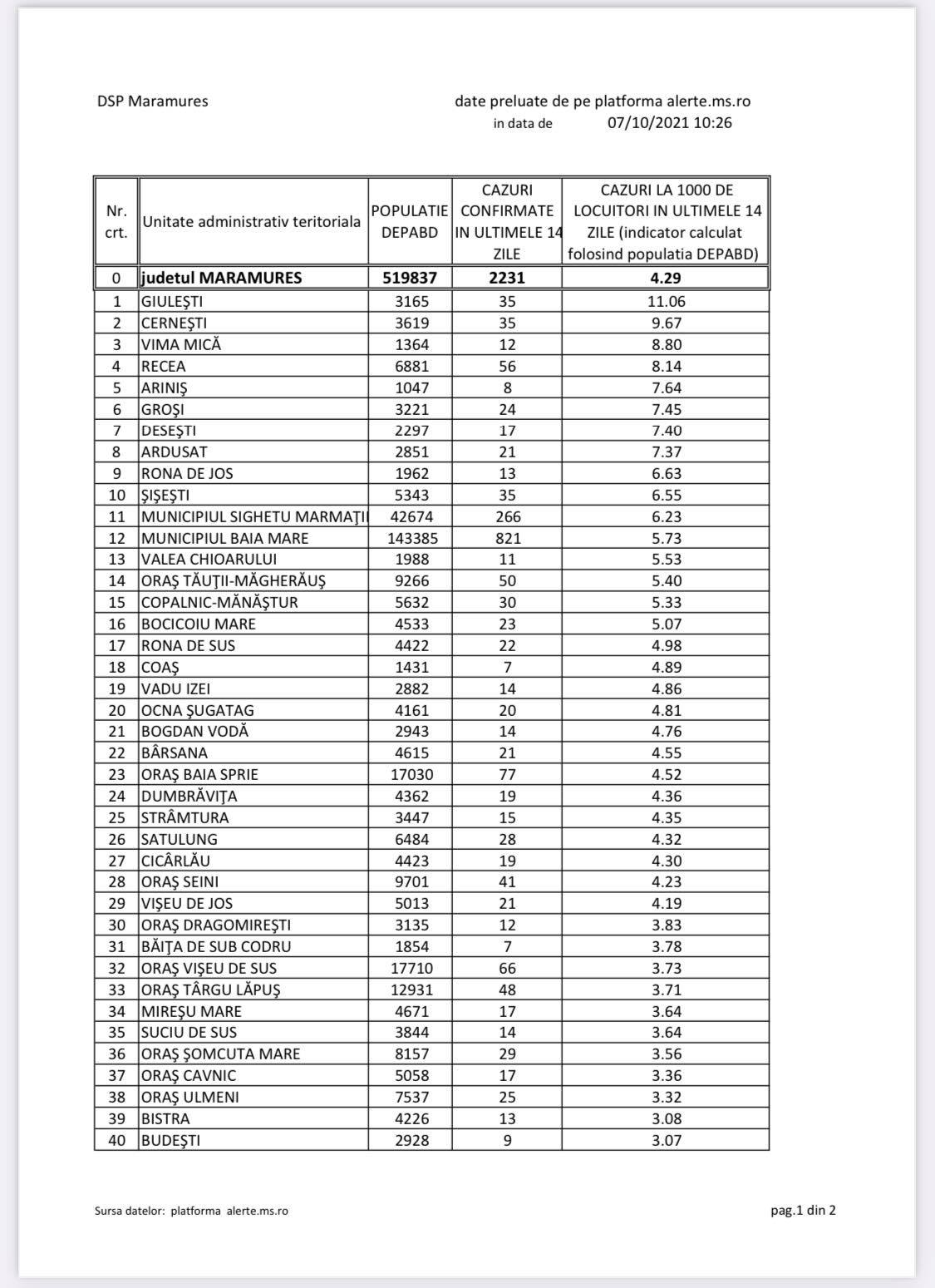 Cu toate acestea reședința de județ are o incidență mult mai mică raportată la mia de locuitori față de celelalte unități administrativ-teritoriale (UAT) care au înregistrat cazuri în aceste două săptămâni. În Maramureș s-au confirmat cazuri în 75 UAT-uri (singura excepţie este Poienile Izei), și aici existând o creștere considerabilă, iar municipiul Baia Mare se află pe locul 12. Pe primele cinci locuri în topul incidenței se află cinci comune, respectiv Giuleşti, Cerneşti, Vima Mică, Recea și Ariniș. Avem în 7 octombrie numeroase UAT-uri unde sunt instituite măsuri suplimentare de protecție. Știm că avem 4 UAT-uri carantinate, Bârsana, Giulești (ambele din 22 septembrie), Recea (din 5 octombrie) și Cernești (din 7 octombrie). Pentru unele din celelalte UAT-uri se vor actualiza măsurile în curând. Ştim sigur că sunt 19 UAT-uri care au incidența mai mare de 3 la mie, dar sub 6 la mie, care au măsuri specifice incidenţei, respectiv Ulmeni, Bistra, Bocicoiu Mare, Asuaju de Sus, Coaş, Seini, Cicârlău, Vişeu de Jos, Târgu Lăpuş, Baia-Sprie, Vişeu de Sus, Băiţa de sub Codru, Tăuţii Măgherăuş, Strâmtura, Suciu de Sus, Rona de Sus, Baia Mare, Sighetu Marmaţiei, Şişeşti. Aşteptăm noile măsuri pentru Groşi, Vadu Izei, Deseşti, Rona de Jos, Ariniş, Recea, Cerneşti, Ardusat, dacă vor fi. Unele au incidenţa peste 6, altele chiar peste 7,5. Cifrele luate în considerare sunt cele de sâmbătă, 3 octombrie, astfel că s-au instituit restricții suplimentare la cea mai recentă ședință de CJSU Maramureș. La cum arată lucrurile putem să ne așteptăm la mai multe situații în intervalul viitor, întrucât tendința este tot de creștere a numărului de cazuri. În prezent, azi avem 5 UAT-uri peste 7,5 (una peste 11, una peste 9, două peste 8 și una peste 7,5), 6 UAT-uri cu incidența peste 6 dar sub 7,5 (3 peste 7 și trei peste 6) și încă 30 UAT-uri cu incidența mai mare de 3 dar sub 6 la mie.