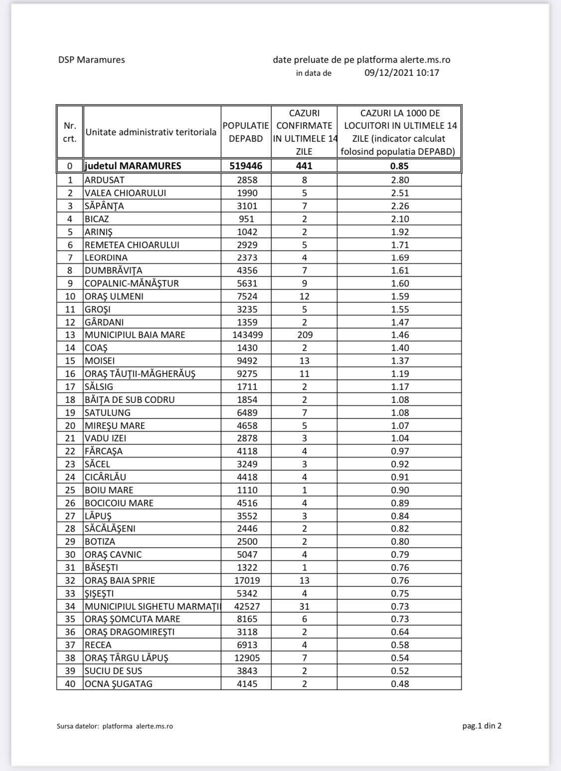 În Maramureș s-au confirmat cazuri în majoritatea celor 76 unități administrativ teritoriale (UAT-uri), în 51 UAT-uri mai exact din total, iar municipiul Baia Mare se află pe locul 13, și se află sub pragul de 2 la mie și a reintrat acum în scenariul verde. Pe primele cinci locuri în topul incidenței se află cinci comune, respectiv Ardusat, Valea Chioarului, Săpânța, Bicaz și Ariniș. Avem în 9 decembrie 4 UAT-uri cu incidența mai mare de 2 dar sub 3, restul sub acest prag.