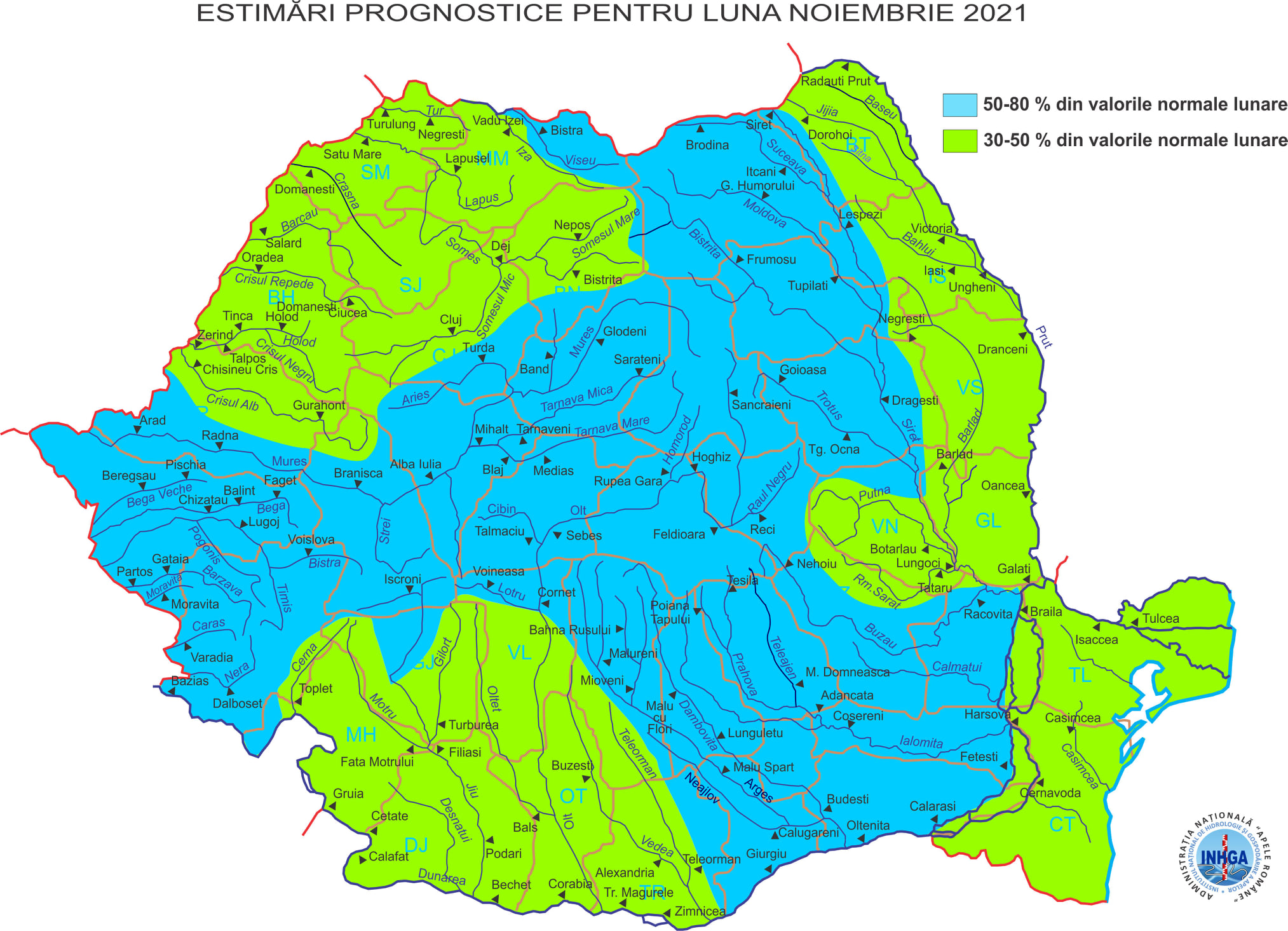 În săptămâna 15-21 noiembrie, valorile termice se vor situa în jurul celor specifice pentru acest interval, în toate regiunile, iar regimul pluviometric va fi deficitar la nivelul întregii țări, dar mai ales în zonele montane. În săptămâna 22-28 noiembrie, temperatura medie a aerului va avea valori apropiate de cele normale pentru această perioadă, pe întreg teritoriul României, iar cantitățile de precipitații vor fi apropiate de cele normale pentru această săptămână, în toată țara. În săptămâna 29 noiembrie – 6 decembrie, temperaturile medii vor fi apropiate de cele normale pentru acest interval, la nivelul întregii țări, iar cantitățile de precipitații vor fi în general apropiate de cele normale pentru această perioadă, în toate regiunile. În săptămâna 7-13 decembrie, mediile valorilor termice se vor situa în general în jurul celor specifice pentru această perioadă, pe întreg teritoriul României, iar regimul pluviometric estimat pentru această săptămână va fi local excedentar în regiunile extracarpatice, iar în rest va fi apropiat de cel normal pentru acest interval. Vom reveni cu amănunte!