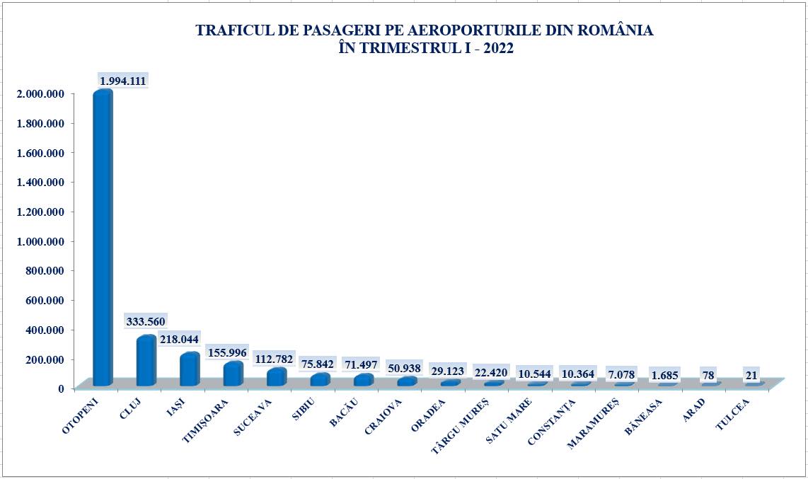 În primul trimestru al anului 2022, traficul a înregistrat un număr de 3.094.083 de pasageri, arată statistica oficială realizată de Asociația Aeroporturilor din țara noastră.