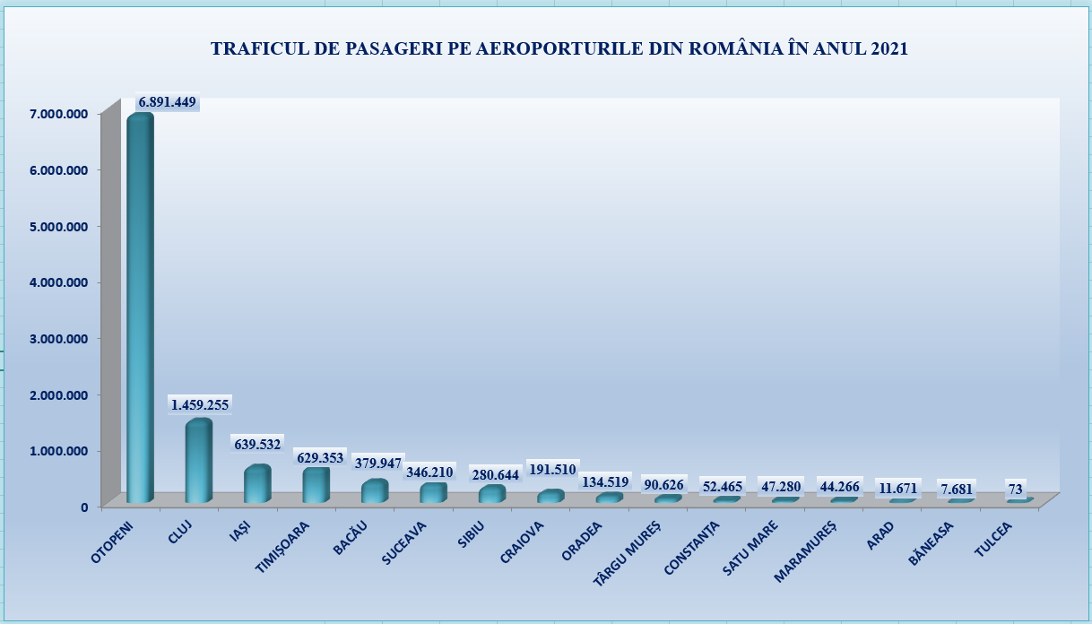 Traficul pe toate aeroporturile din România a crescut anul trecut la 11,2 milioane de pasageri, de la 7,2 milioane de pasageri în 2020, primul an de pandemie, în care aproape două luni avioanele au stat mai mult la sol decât în aer. Spre comparație, în 2019, traficul total de pasageri de pe toate aeroporturile a fost de peste 23 de milioane.