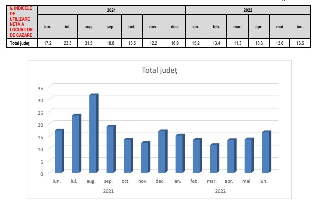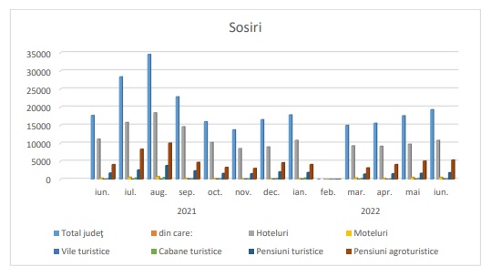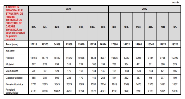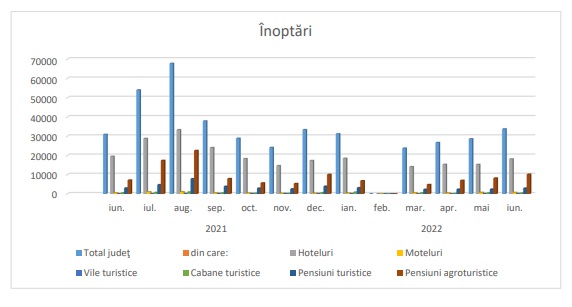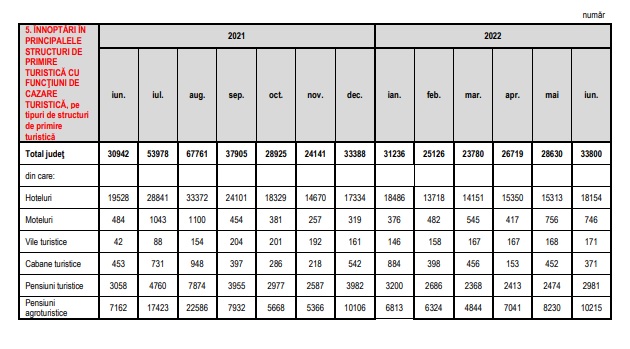 Capacitatea de cazare turistică în funcţiune a structurilor de primire turistică în semestrul I 2022 a fost de 1.438.652 locuri-zile, mai mare cu 34,8% faţă de semestrul I 2021. În semestrul I 2022 pensiunile agroturistice au deținut cea mai mare pondere (34,1%) din totalul capacităţii de cazare turistică în funcţiune, fiind urmate de hoteluri 30,6%, pensiuni turistice 12,3%, hosteluri 2,7% şi restul tipurilor de structuri de primire turistică cu funcţiuni de cazare turistică 20,3%.