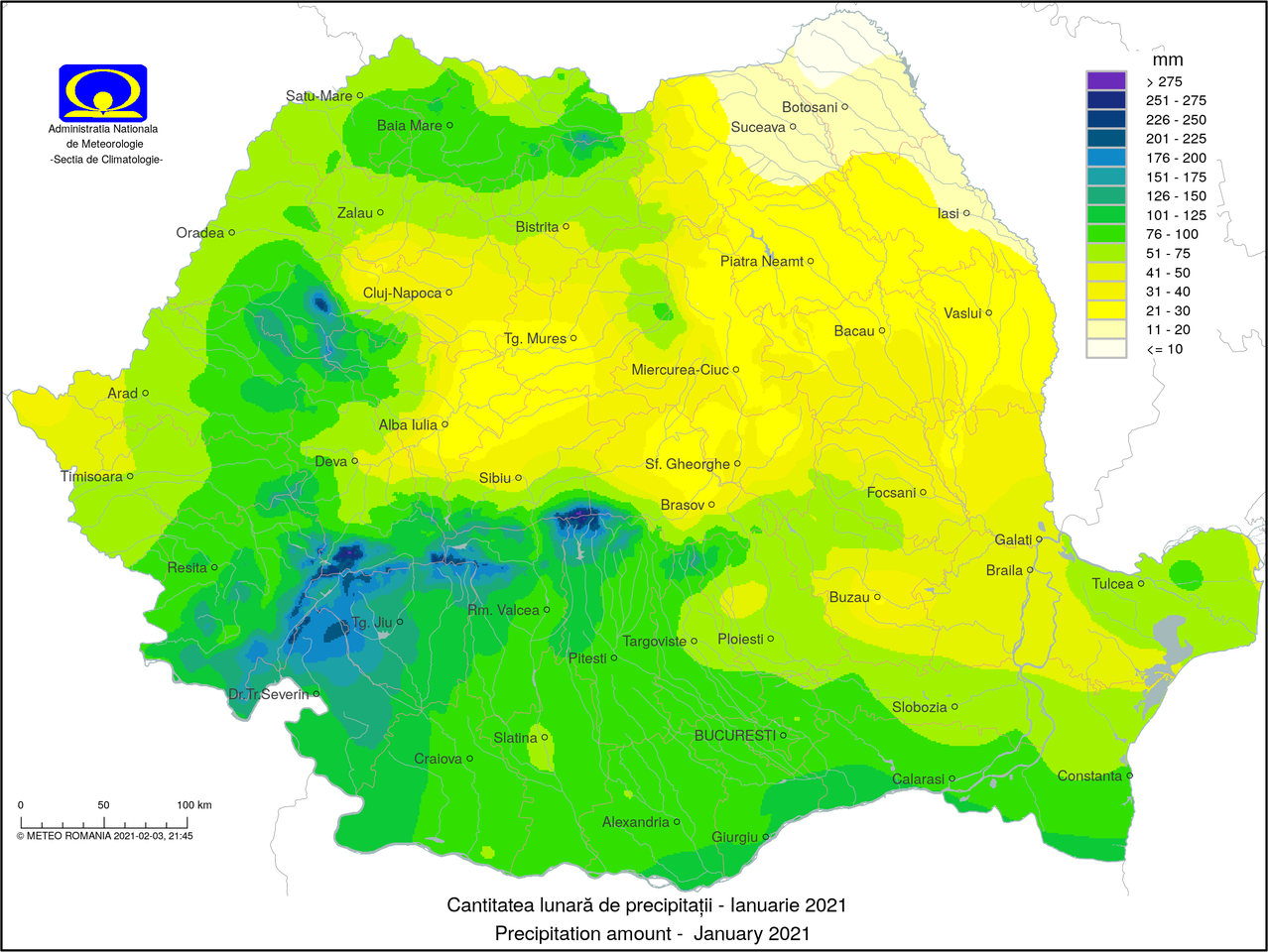 Crișana: – ianuarie 2021 – 75,7 l/mp, față de media (1981-2010) –45,4 l/mp