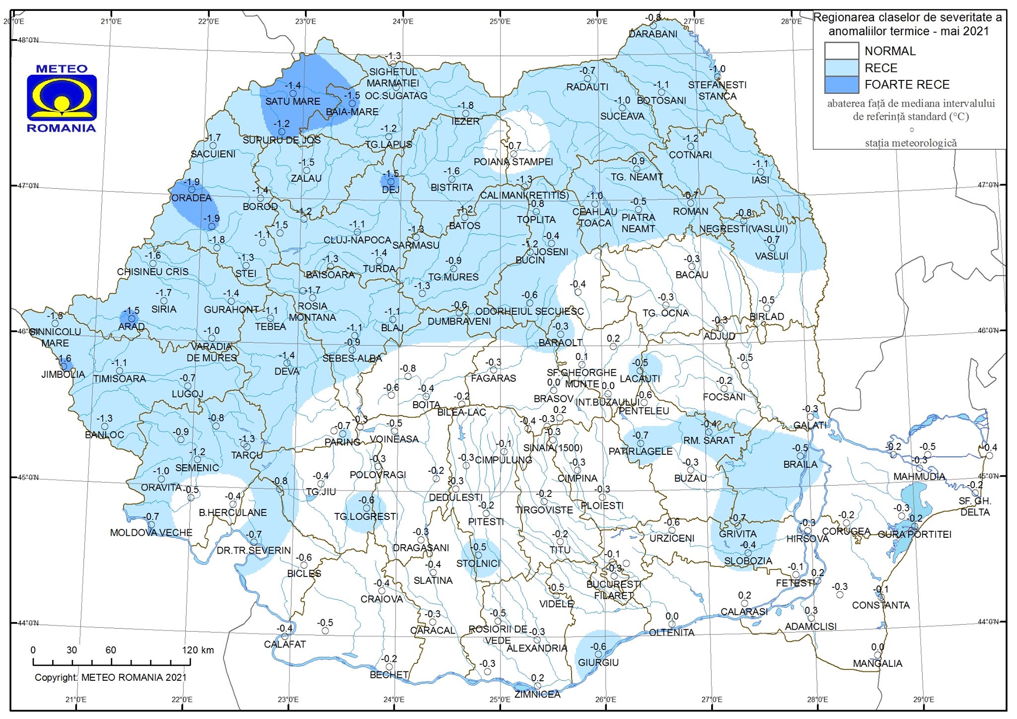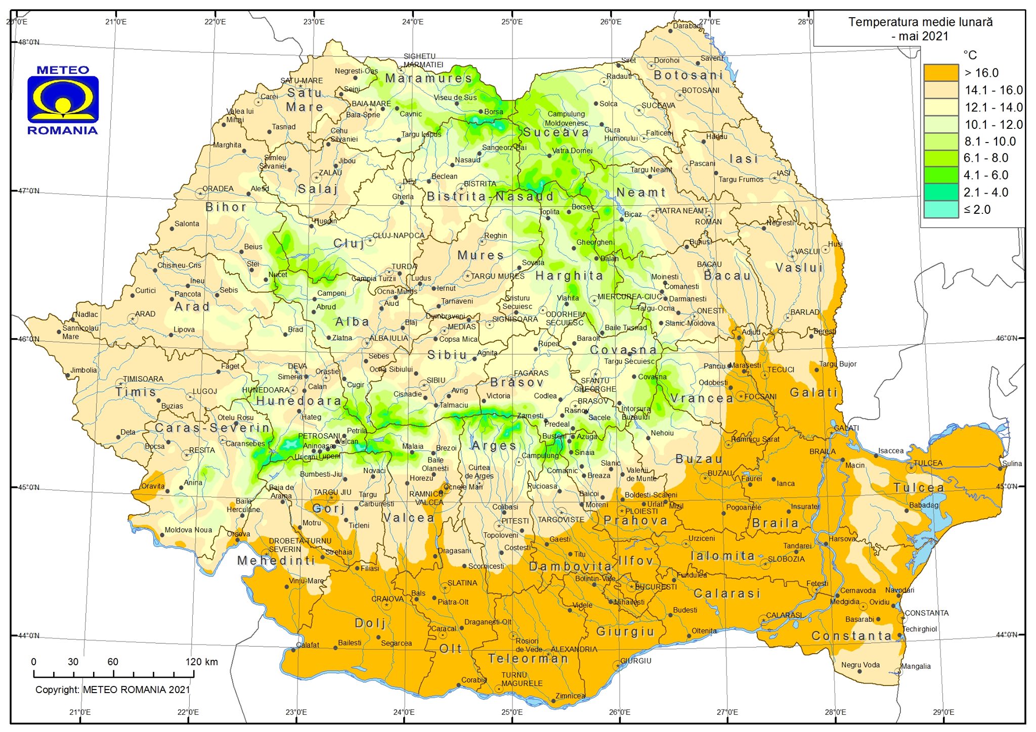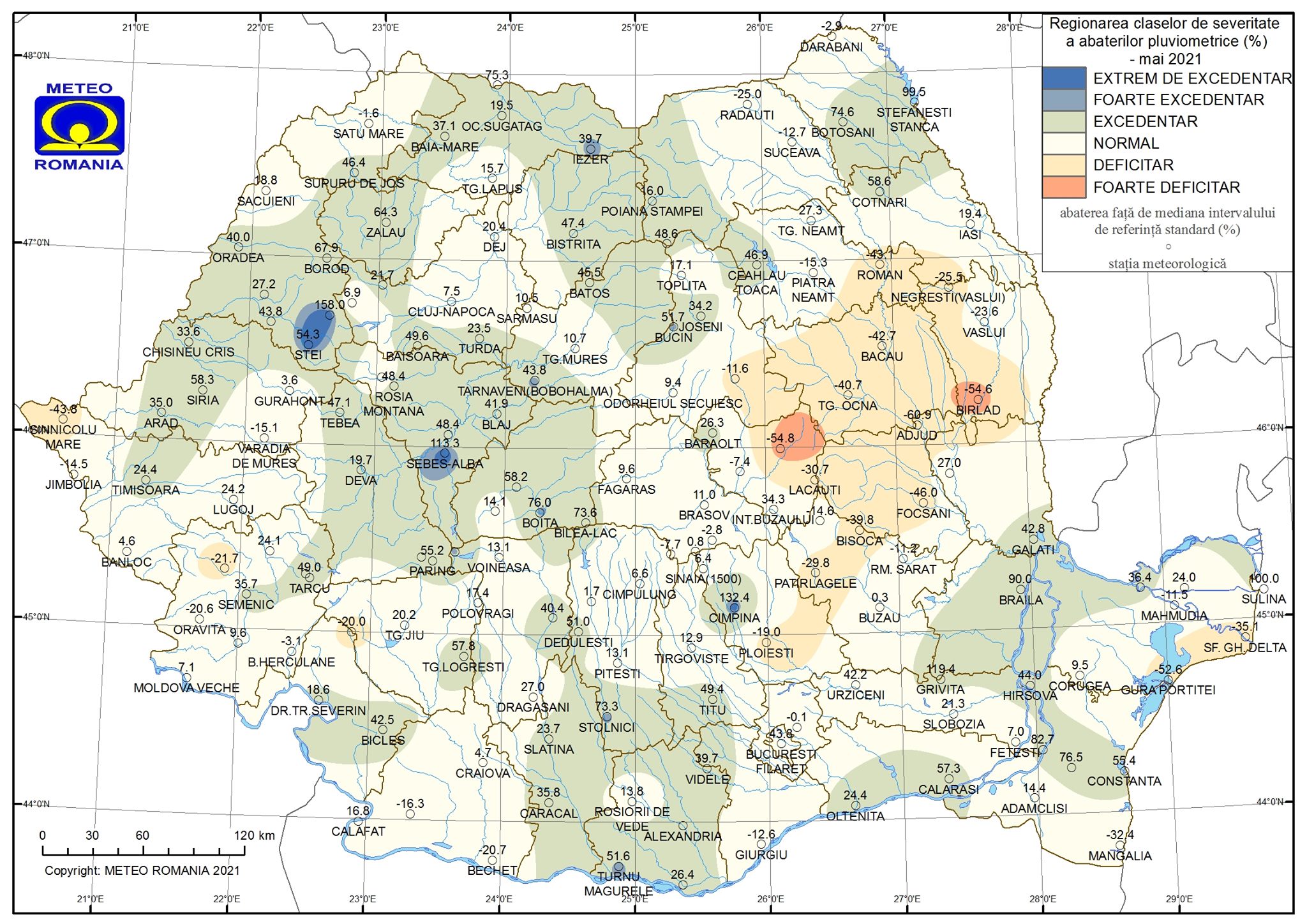 Cantitatea maximă absolută de precipitații a lunii mai a fost depășită la stația Stâna de Vale, unde s-a înregistrat o cantitate de precipitații de 392,4 mm față de cantitatea lunară maximă absolută de 362,5 mm. Cantitatea maximă absolută de precipitații căzută în 24 de ore a fost depășită la Stâna de Vale, unde s-a înregistrat o cantitate de precipitații de 181,6 mm față de cantitatea de precipitații căzută în 24 de ore maximă absolută de 79,8 mm. Temperatura medie a lunii mai 2021 a avut valori cuprinse între 0,5 °C, la stația meteorologică Vf. Omu și 17,9 °C, la stația meteorologică Zimnicea. Cele mai mari valori, peste 16 °C, s-au înregistrat în cea mai mare parte a Munteniei, Olteniei și Dobrogei, în sudul și estul Moldovei și izolat, în sudul Banatului. Cele mai mici valori, sub 2°C, s-au înregistrat pe crestele montane înalte. Abaterea temperaturii medii a aerului din luna mai 2021 față de mediana intervalului de referință standard (1991-2020) a fost negativă în aproape toată țara. Cea mai mare valoare a abaterii negative a fost 1,9 °C și s-a înregistrat la stațiile meteorologice Oradea și Holod. Analizând încadrarea în clase de severitate a anomaliilor termice, se poate observa că regimul termic a fost rece pe areale extinse din Banat, Crișana, Transilvania, Maramureș, în jumătatea nordică și sudul extrem al Moldovei, local, în Muntenia și Oltenia și izolat, în unele zone montane.