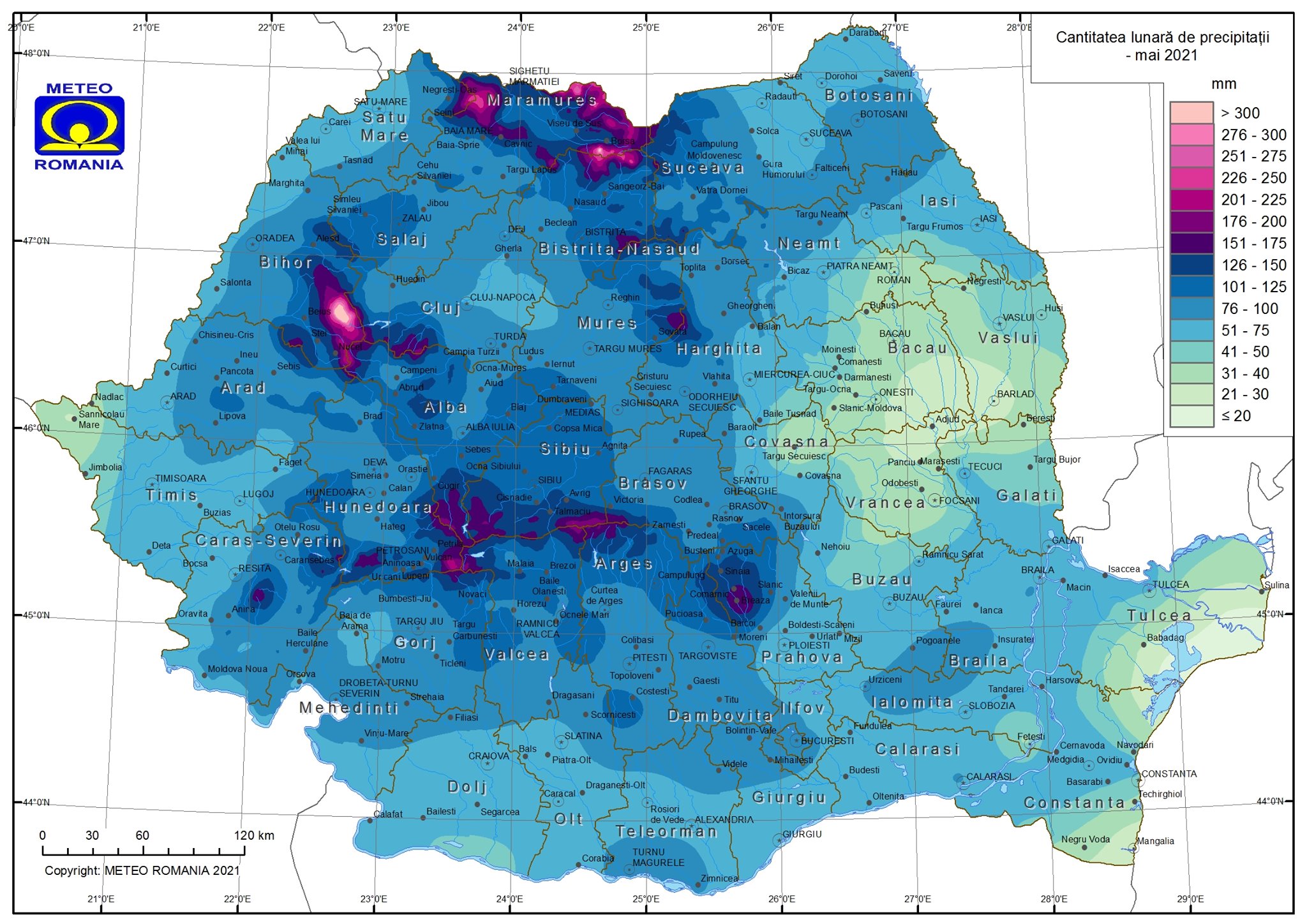 Cantitatea totală de precipitații din luna mai 2021 a avut valori ridicate, peste 50 mm, în Transilvania, Maramureș, Crișana, Oltenia, în cea mai mare parte a Munteniei și a Banatului, precum și pe areale extinse din Moldova și Dobrogea. Cantităţi de precipitaţii sub 50 mm au fost înregistrate în centrul, estul și sud-vestul Moldovei, în vestul Banatului, nord-estul și sud-estul Dobrogei, Delta Dunării și izolat, în sudul Olteniei și estul extrem al Munteniei. Cea mai mare valoare a cantităţii totale de precipitaţii din luna mai 2021 a fost de 392,4 mm, înregistrată la stația meteorologică Stâna de Vale.