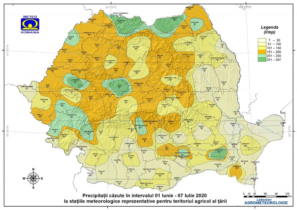 Însă, episoade cu ploi am avut și după 1 iulie, episoade mai active înregistrându-se în zilele de 4 și 7. S-a ajuns în situația în care tot arealul de la colțul nord-vestic al județului Maramureș până în estul extrem, incluzând centrul și, local, sudul și sud-estul, să fie incluse în categoria 251-279 l/mp în intervalul 1 iunie – 7 iulie. Urmează „o bretea”, care înconjoară zona cea mai afectată, care a fost inclusă în categoria 201-250 l/mp în același interval de timp menționat. Vestul, sud-vestul și local sudul județul Maramureș se află, cu ploile căzute, în 1-7 iulie, în categoria 151-200 l/mp. Asta înseamnă că precipitațiile din ultima săptămână „au îngroșat” statsitica simțitor, conform unui document oficial al Agenției Naționale de Meteorologie (ANM).