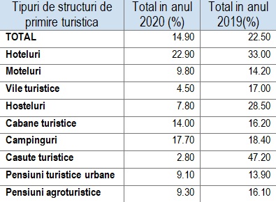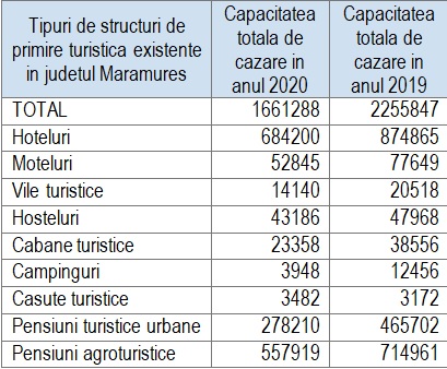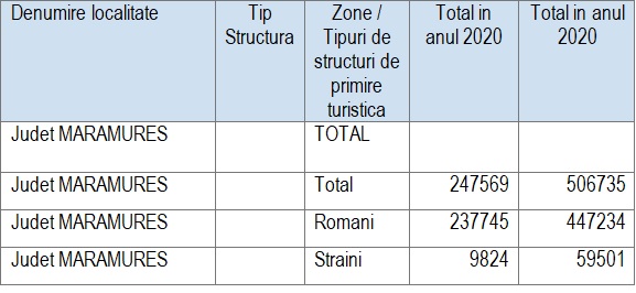 Comparativ cu anul 2019, în cursul anului 2020, numărul înnoptărilor a scăzut cu 51,1% pe total, cu 46,8% la turiştii români, în timp ce la turiștii străini a scăzut și cu 83,5%, conform raportului întocmit de reprezentanții Direcției Județene de Statistică Maramureș.