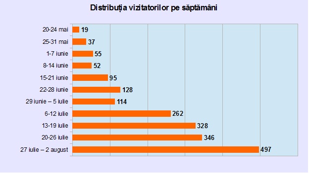 După cum se evidențiază și în graficele de mai jos, începând cu mijlocul lunii iunie, gradul de prezență a vizitatorilor în Muzeu a crescut. Astfel, în primele două săptămâni au fost înregistrați peste 50 de vizitatori, iar ultimele două săptămâni ale acestei luni înregistrând aproape și peste 100 de vizitatori.