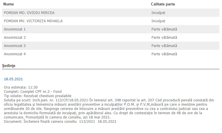 Cei doi suspecți se află în arest preventiv în prezent, ancheta fiind coordonată de DIICOT. Însă, culmea culmii este faptul că, recent, mai exact zilele trecute, cei doi au solicitat, să scape de arestul preventiv, solicitând fie arest la domiciliu, fie (atenție!) control judiciar. Nu li s-a permis! Instanța a spus „pas” solicitării lor. „Inch.pen. nr. 113/CP/18.05.2021-În temeiul art. 348 raportat la art. 207 Cod procedură penală constată din oficiu legalitatea şi temeinicia măsurii arestării preventive a inculpaţilor P.O.M. şi P.V.M,măsură pe care o menţine pentru următoarele 30 de zile. Respinge cererea de înlocuire a măsurii arestării preventive cu cea a controlului judiciar sau cea a arestului la domiciliu formulată de inculpaţi, prin apărătorul ales. Cu drept de contestaţie în termen de 48 de ore de la comunicare. Pronunţată în camera de consiliu, azi 18 mai 2021”, se arată în soluția pe scurt. Vom reveni cu detalii!