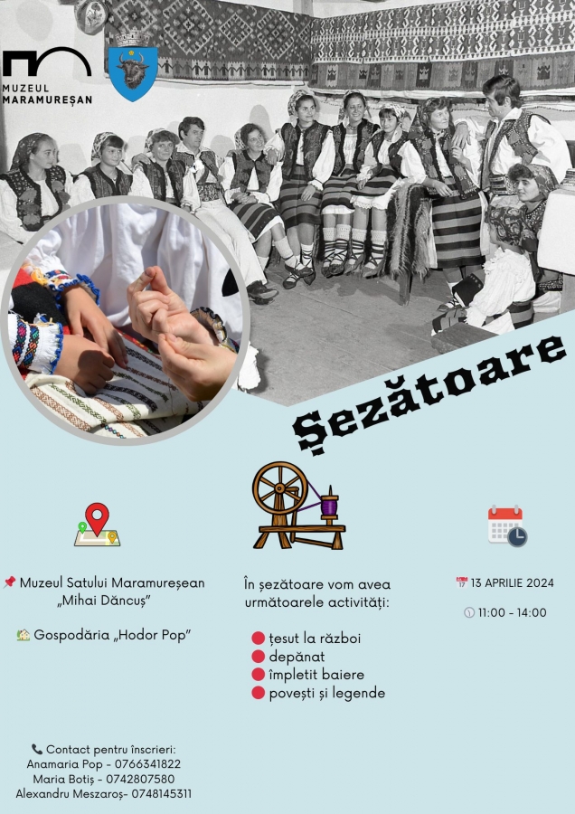 Sâmbătă, 13 aprilie, Muzeul Maramureșan din Sighetu Marmației vă invită la șezătoare. Manifestarea va avea loc între orele 11.00 și 14.00, locația fiind Gospodăria „Hodor Pop”.