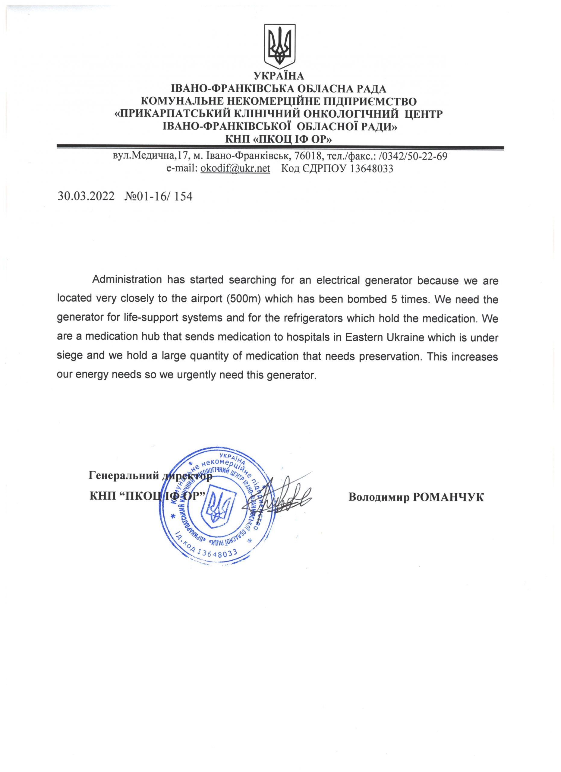 „Clinica are nevoie de un generator de electricitate pentru a funcționa, având în vedere frecventele pene de curent. Ea are nevoie de energie electrică suplimentară și pentru a prezerva medicamentele pentru pacienții oncologici din întreaga Ucraină, fiind un hub de colectare al acestor medicamente. Inițiativa pornită de la Colegiul Național “Vasile Lucaciu” din Baia Mare (prin doamna Carmen Matiaș) și Asociația de Părinți a Colegiului Național “Vasile Lucaciu” (prin doamna Libotean Ionela) a adus alături Asociația “Filantropica Sf. Ierarh Iosif Mărturisitorul”, Asociația “Filantropia Maramureșeană”, Asociația “Centrul de Inovare și Dezvoltare Durabilă Nord-Vest”, respectiv Asociația “Standarde pentru Baia Mare””, mai arată Ionuț Fodoruț.