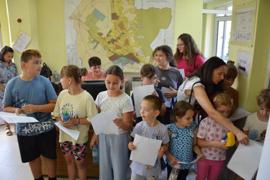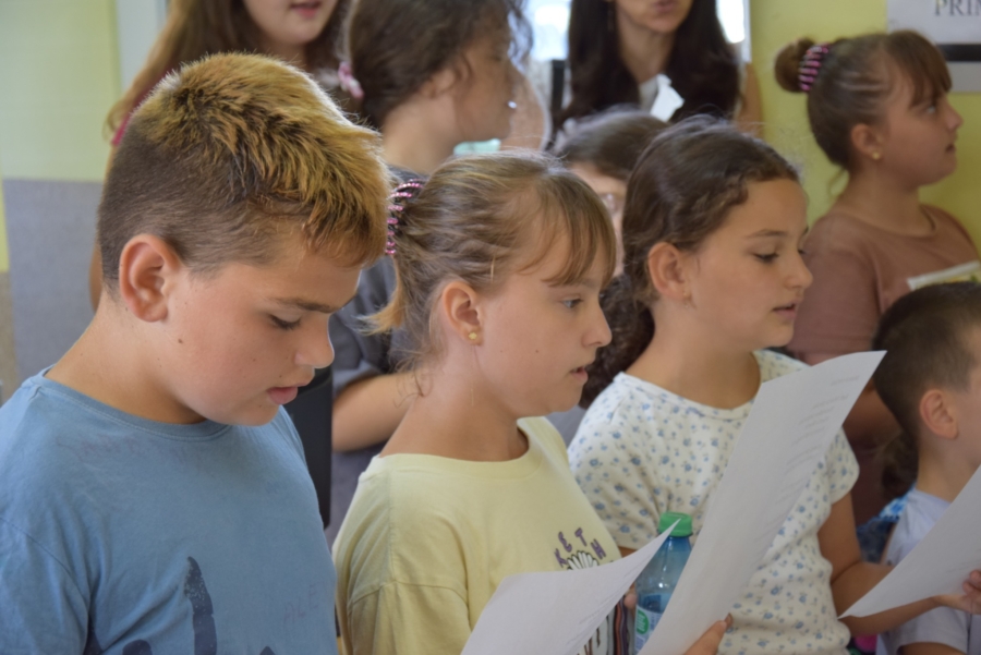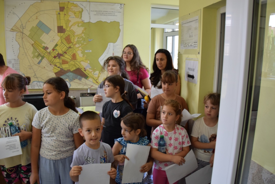 Cei mici au învățat priceasna „Maica cerului”, pe care au interpretat-o ieri, 8 august, în cadrul vizitei la Primăria orașului Seini.